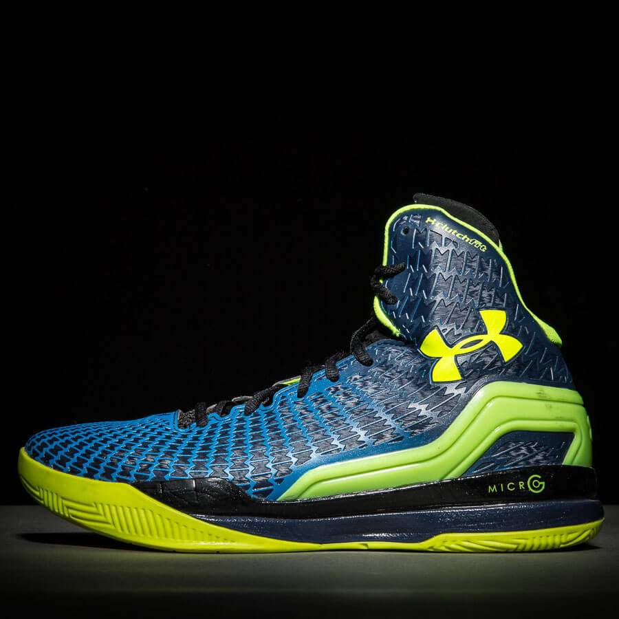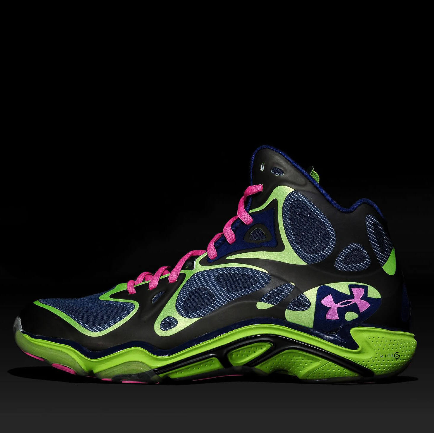 UA Anatomix Spawn 猶如外星生物的特殊外型絕對是近年最有記憶點的作品之一,設計師 Ross Klein過去曾在訪談中提及,人類的腳掌可說是全身最精密複雜的部位,因此他與開發團隊在設計過程中參考了許多運動員的足部運作軌跡,觀察骨骼、肌肉、韌帶等組織的情況去整合出所需性能後,以打造出一雙「零死角」的鞋款為目標。Flexgear 鞋面層層交疊的作法兼具了包覆與透氣效能的考量,中底外側如人體骨架般的 TPU 結構肩負起支撐之用,搭配上全腳掌 Micro G 材質,這項 UA 獨家配方擁有良好的緩震回饋特性,提供選手在比賽中所需的迅速反應。Stephen Curry 在加入 Under Armour 旗下之初正是以這款作為主要戰靴。