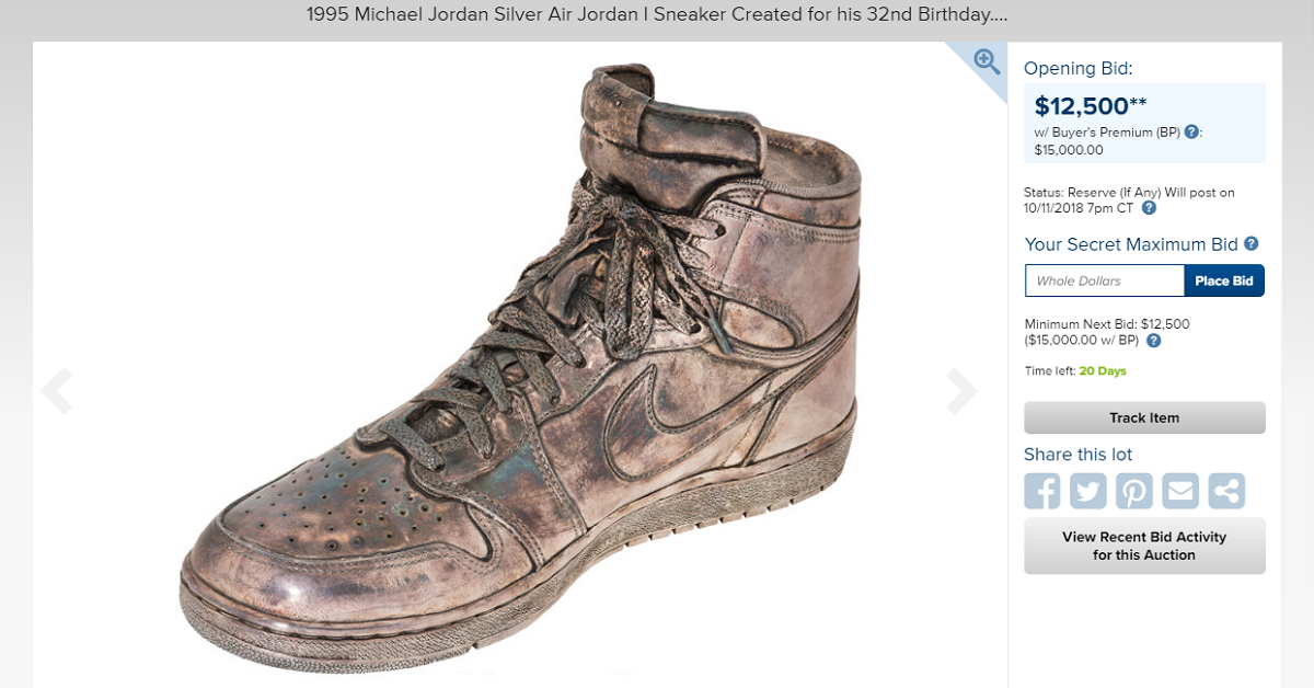 該雙純銀製 Air Jordan 1 誕生於 1995 年,是 Michael Jordan 前妻Juanita Jordan 給他訂做的 32 歲生日禮物。鞋款由以色列製造,鞋款模具在生產完後便銷毀,全球僅有 10 雙,其中兩雙由喬丹本人蒐藏,其餘的則放在芝加哥博物館、喬丹名下的餐廳等地展出,而今有一雙就出現在 Heritage Auctions 競標。