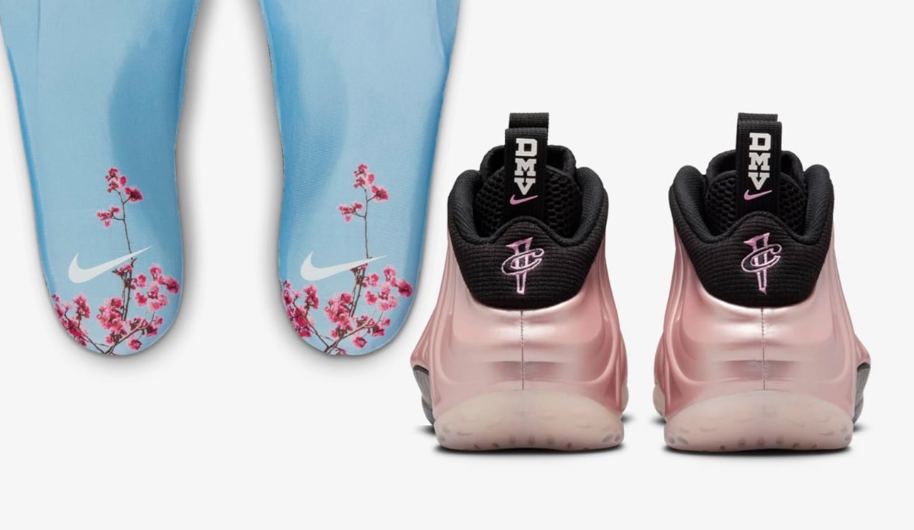 既然是以櫻花為主題,這次 Air Foamposite One ‘DMV Cherry Blossom’ 就以淡粉紅為主角配色,鞋墊則使用了櫻花配上藍天的圖樣,特別的是,鞋款後跟有著「DMV」字樣,他們分別應對的就是華盛頓哥倫比亞特區 (Washington, D.C.)、馬里蘭州 (State of Maryland)、維吉尼亞州 (Commonwealth of Virginia),不特別說的話,還真讓人以為是聯名版呢。