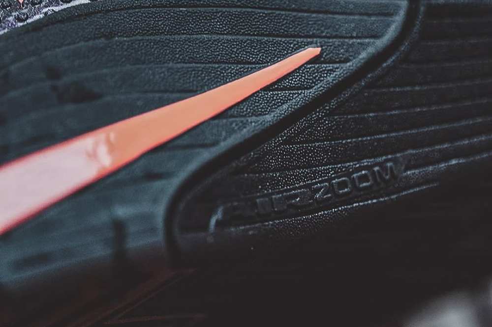 外底由 XDR 耐磨橡膠構成,紋路則選擇最傳統的大面積粗獷人字紋,腳跟延伸至後掌的粉色 Nike Swoosh 上刻有「Nike Street」字樣,強調其街頭籃球屬性。
