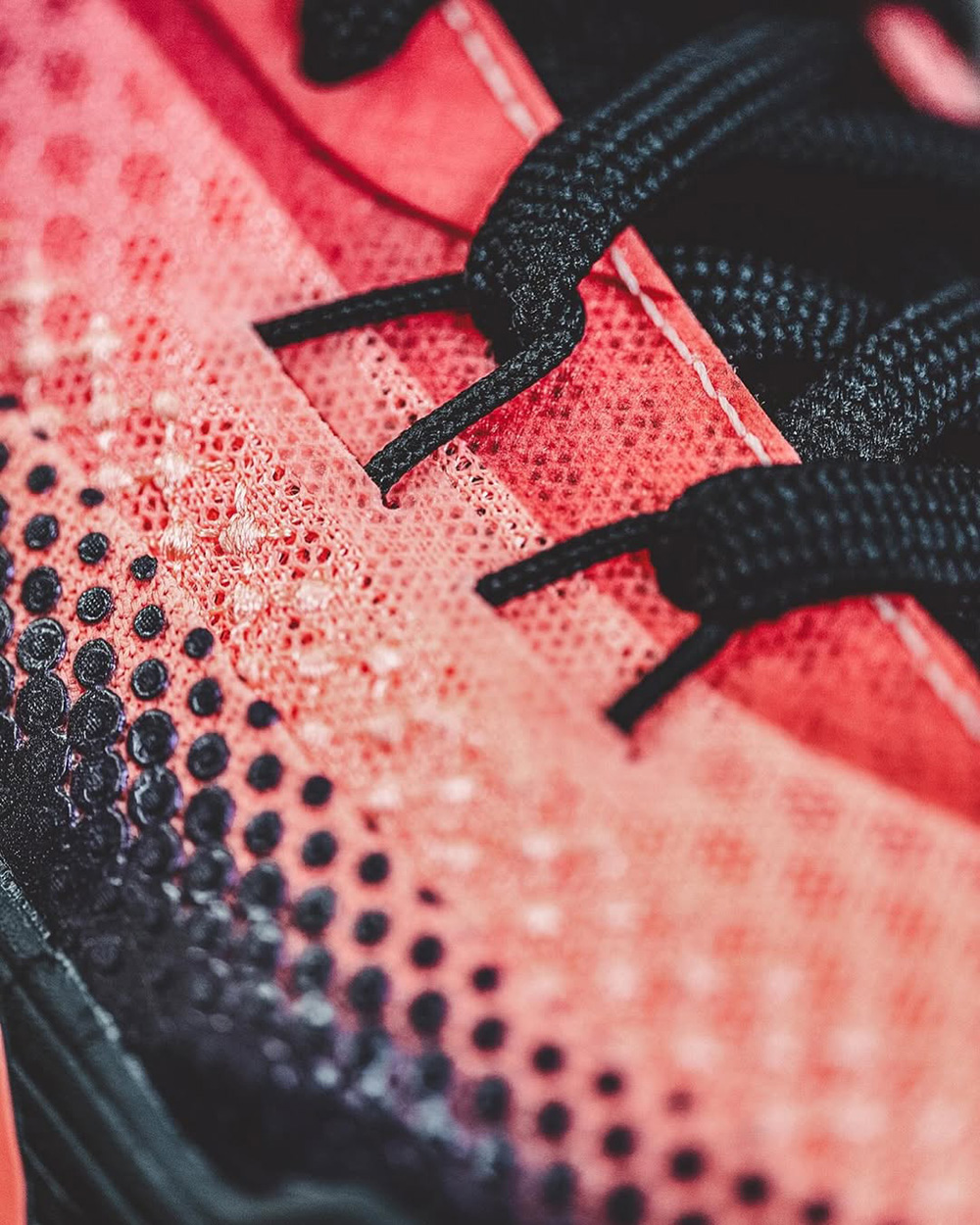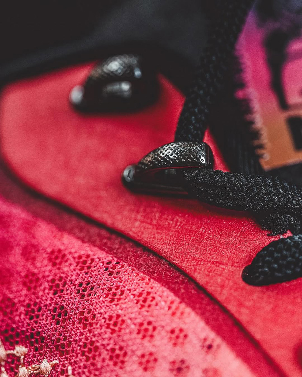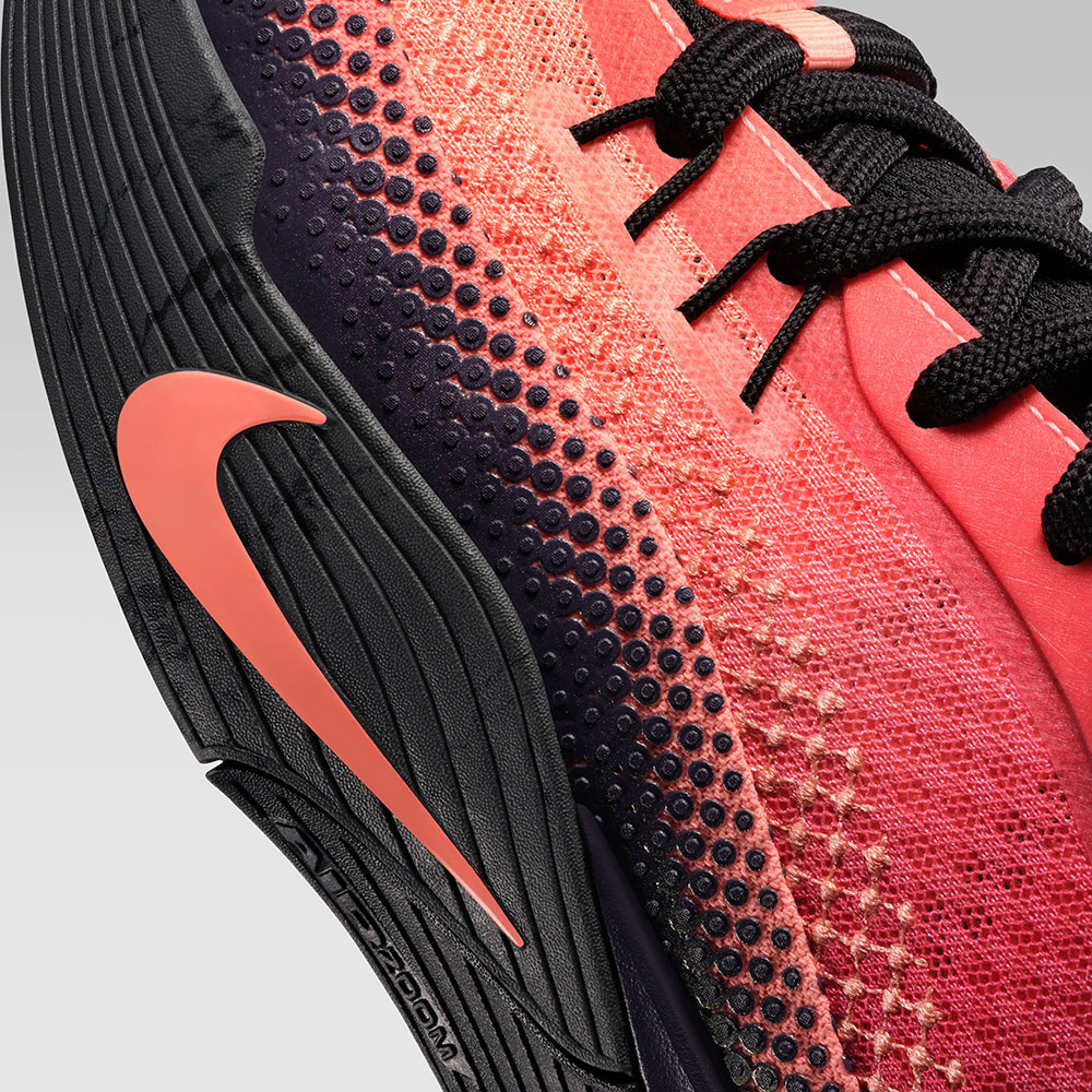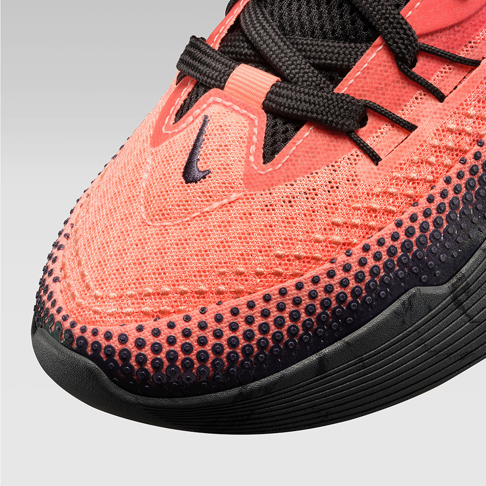 鞋帶孔有著熱壓塗層補強,後兩對採用金屬鞋帶孔設計,前兩對則結合 Flywire 技術,搭配中前掌大面積的外底橡膠上翻,提供橫向移動時的雙重支撐。
