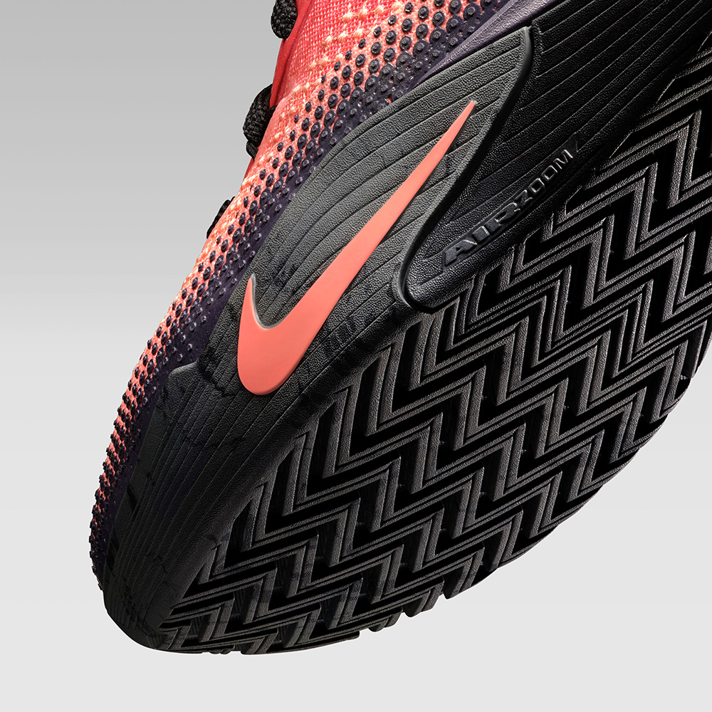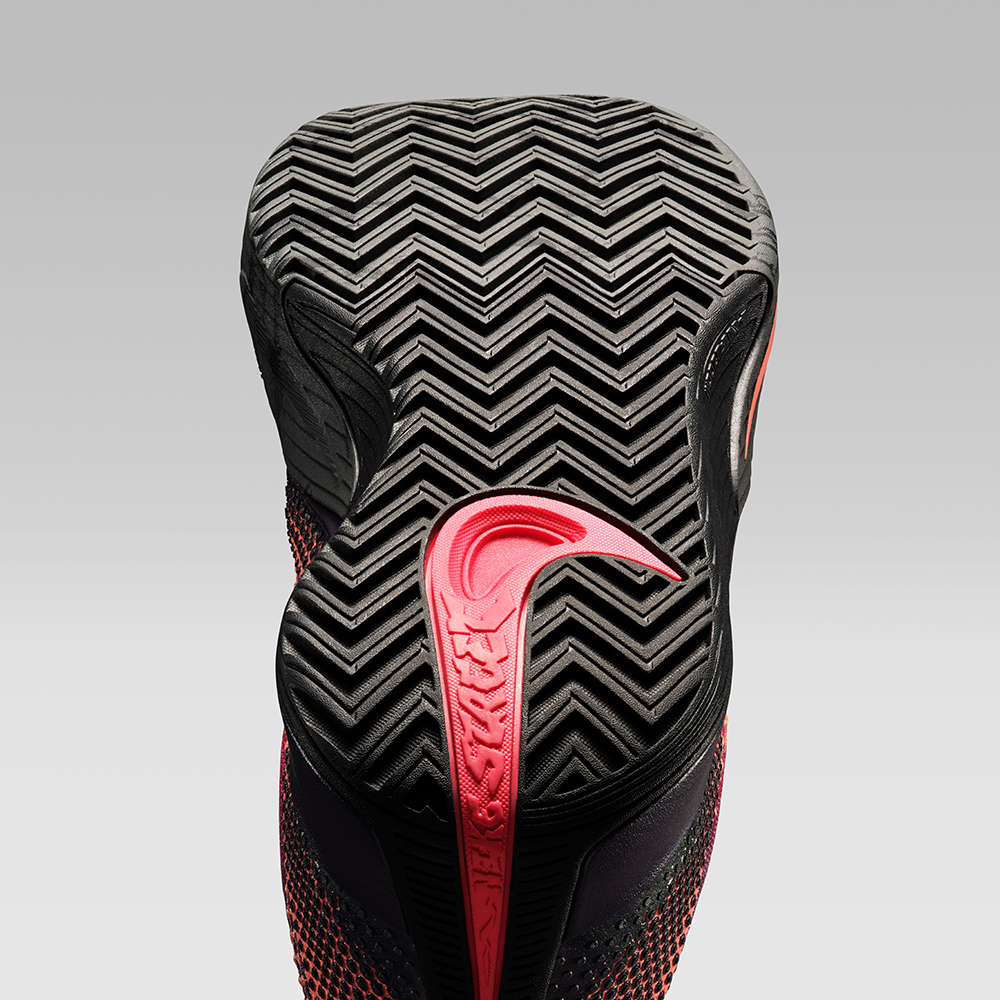 外底由 XDR 耐磨橡膠構成,紋路則選擇最傳統的大面積粗獷人字紋,腳跟延伸至後掌的粉色 Nike Swoosh 上刻有「Nike Street」字樣,強調其街頭籃球屬性。
