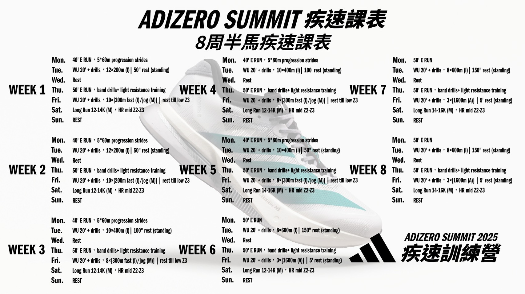 在本次《ADIZERO SUMMIT 疾速訓練營》中,adidas 特別攜手來自北中南的十大知名跑團與跑班,共同打造最完整的系統化訓練計畫,讓跑者即使在休賽季,也能穩定進步、蓄力備戰年底馬拉松賽季。參與單位涵蓋「相信跑步訓練營」、「愛迪生跑步訓練班」、「吉日跑班」、「跑者肌地」、「儒意運動」、「閃耀跑團 Shine Running Club」、「DHRC 夢想高飛跑團」、「IR Sports」、「NID RUN CLUB」、與「TIRTC_Training Club」,不僅集結了台灣各地最具實力的教練資源與社群影響力,更體現 adidas 長期深耕跑步文化的決心。這些跑團以不同特色與目標族群為核心,共同為跑者設計專屬課表,從入門進階到競速備戰,全面涵蓋 10K、半馬到全馬等多種訓練需求,讓每一位跑者都能在社群的支持與專業的引導下,朝向「練就最快」的目標前進。