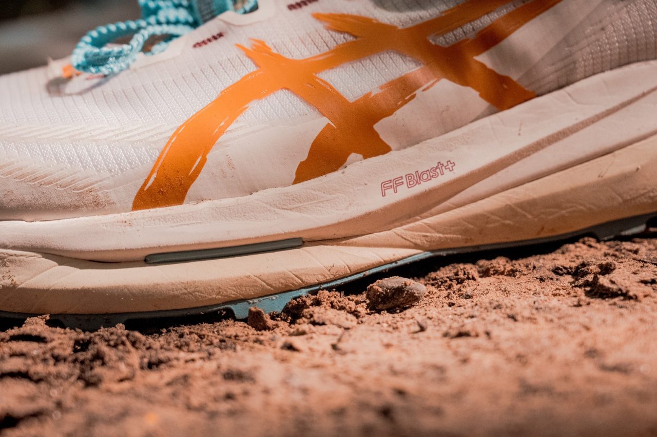 FUJISPEED 4 一大變革,即是中底配置,首先推進板材質從前兩代的碳纖維改為 PEBAX,編輯推測應該是超級越野鞋 METAFUJI TRAIL 的誕生,ASICS 為區隔兩者功能而做出調整吧?讓不同程度的跑者能找到相對合適的選擇;整個中底用雙層 FF BLAST+ 科技來建構,搭配 PEBAX 推進板的作用,是專為越野跑運動而調校的黃金組合,不僅給予腳掌高效回饋,遇到有坡度的路段時亦能展現其剛性,提供必要的支撐力。