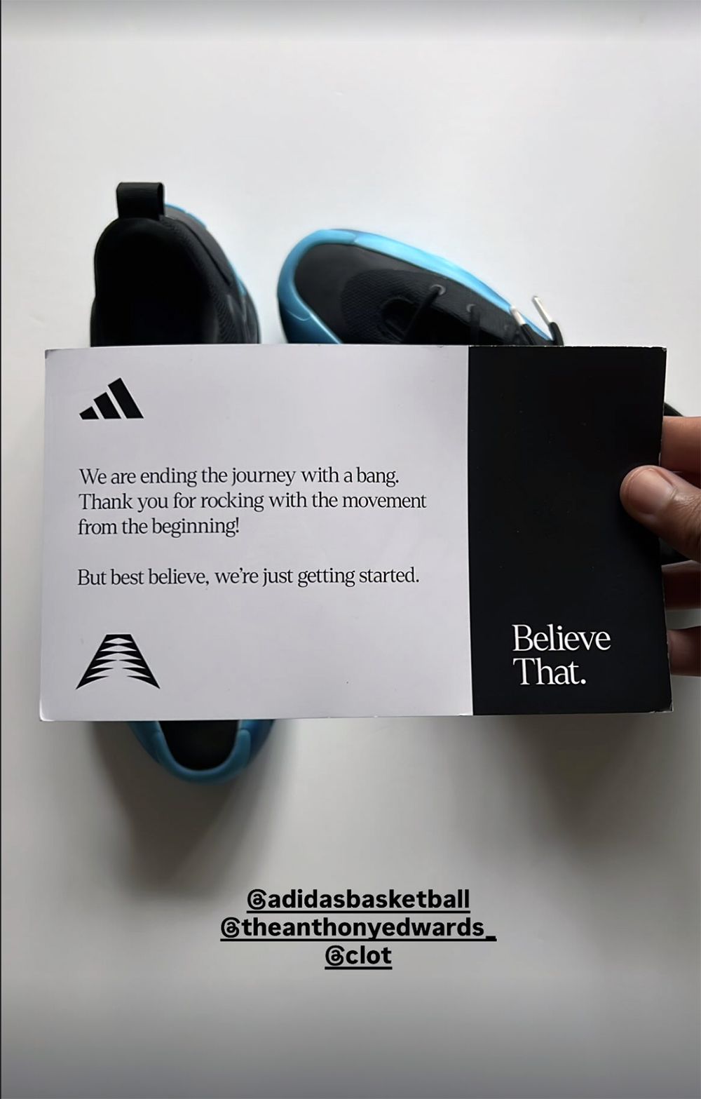 國外媒體 Complex 和 Highsnobiety 近日陸續釋出實鞋開箱與大家分享,其中 Highsnobiety 的社群編輯 Jeffrey D. Lockhart 更曝光了鞋盒內附上的卡片,內容提到這雙聯名鞋款將會是 Anthony Edwards 1 的最終章,看來接著就是要迎接二代登場了。