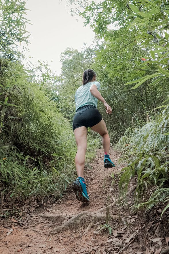 這次路線包含了青苔石階、泥濘小徑、繩索段與鋪面道路。前一日剛好完成一場近百公里的長距離單車騎乘,因此這次安排的是一趟作為恢復用途的野跑訓練。Mafate 5 的中底在腳步疲乏、狀態尚未完全恢復的狀況下展現出高度支撐力,不會讓腳陷進去,卻能吸收下坡與碎石對腳掌的衝擊。從林道轉接回柏油路的那段切換中,泡棉中底的彈性感非常明顯,甚至有一種穿上公路鞋的錯覺。