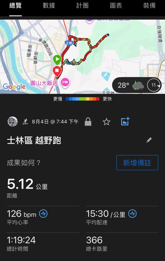 拿到 Mafate 5 後迫不及待地做了幾次測試,其中印象最深刻的是 HOKA Taipei Series Run 第一場活動。路線從劍潭捷運站出發,沿著水神社一路陡上後接進一般林道。看完夜景後,我特別挑了一段滿是乾竹葉與碎石的陡滑下坡,一路陡下至軍營,刻意測試鞋款的止滑抓地表現。