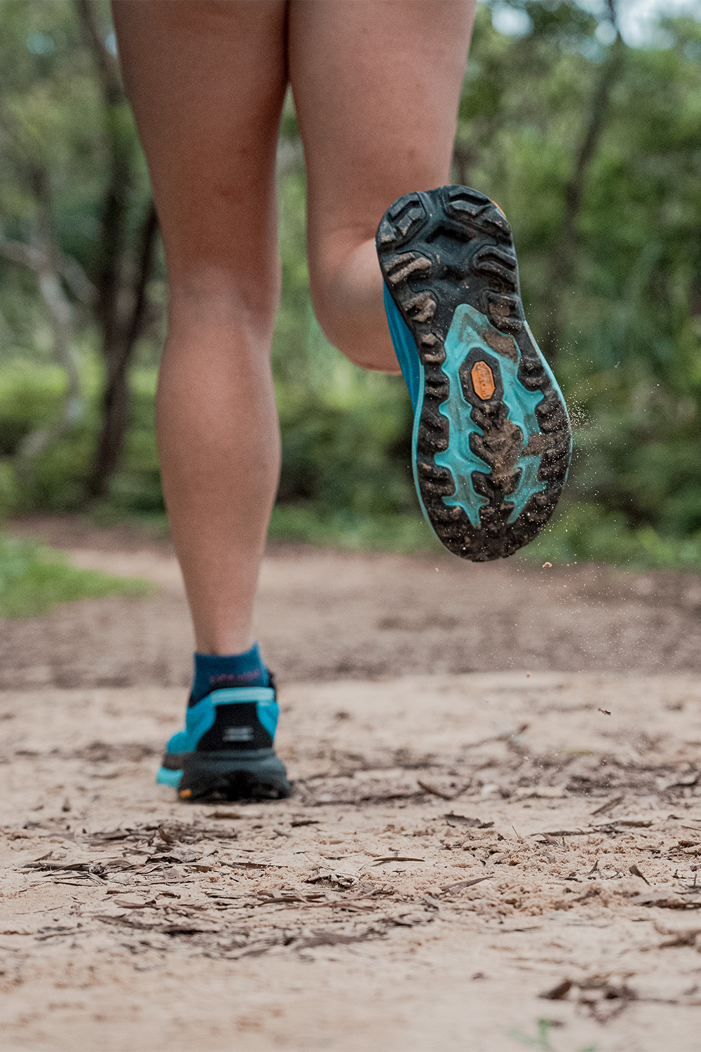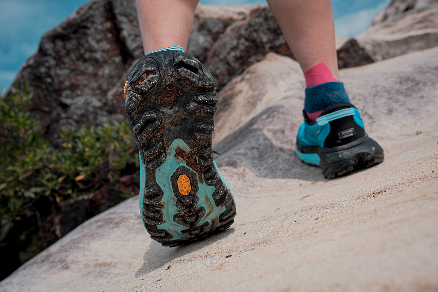 結果讓我非常驚艷!即使面對鬆動落葉與濕滑岩面,Vibram® Megagrip 搭配 5mm 齒深依然穩定,幾乎沒有打滑。這樣的抓地性能,讓我在陡坡下行時也能安心施力。中底不會陷腳,也不過度柔軟,保有清晰的回饋與支撐力。
