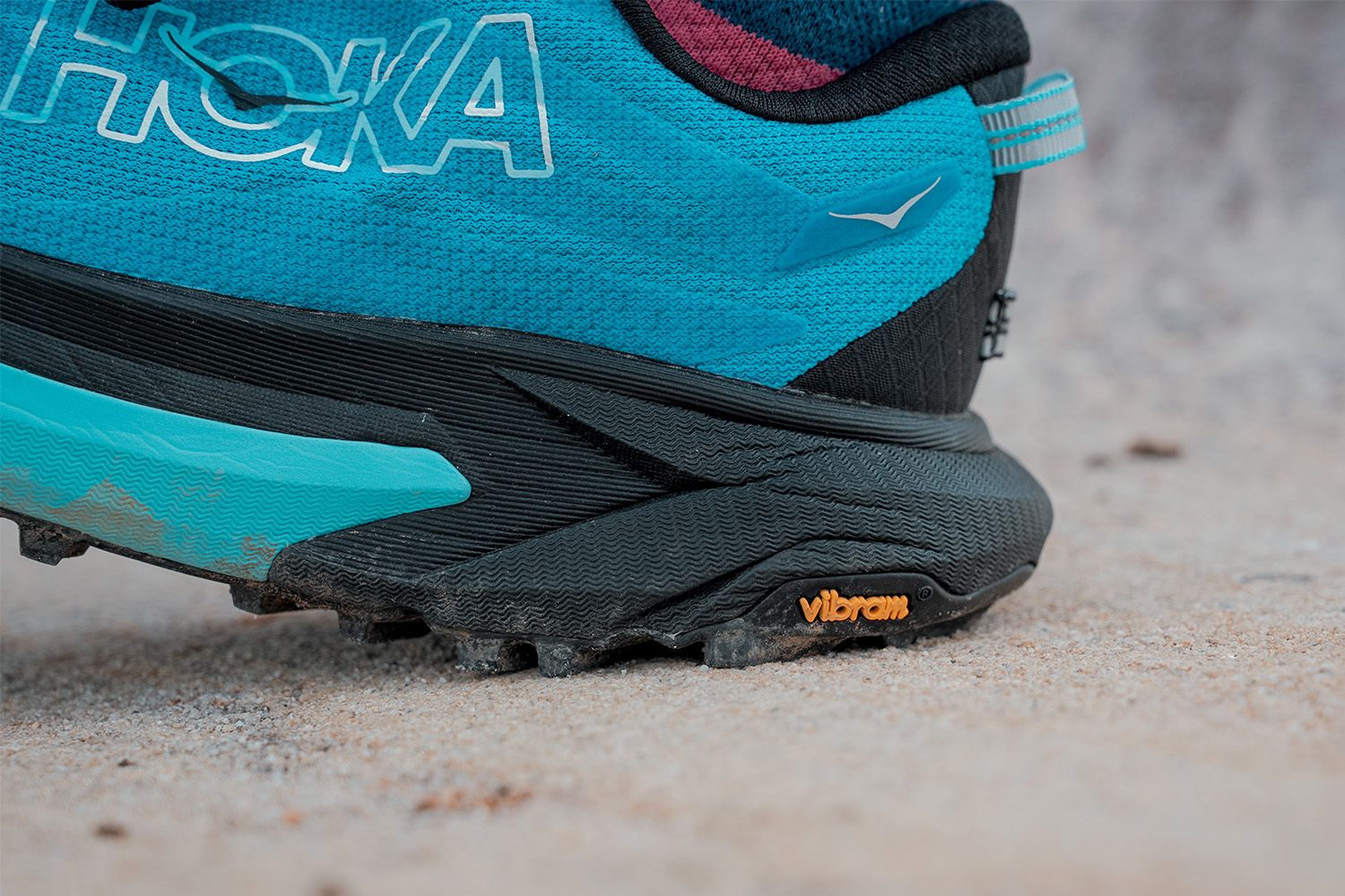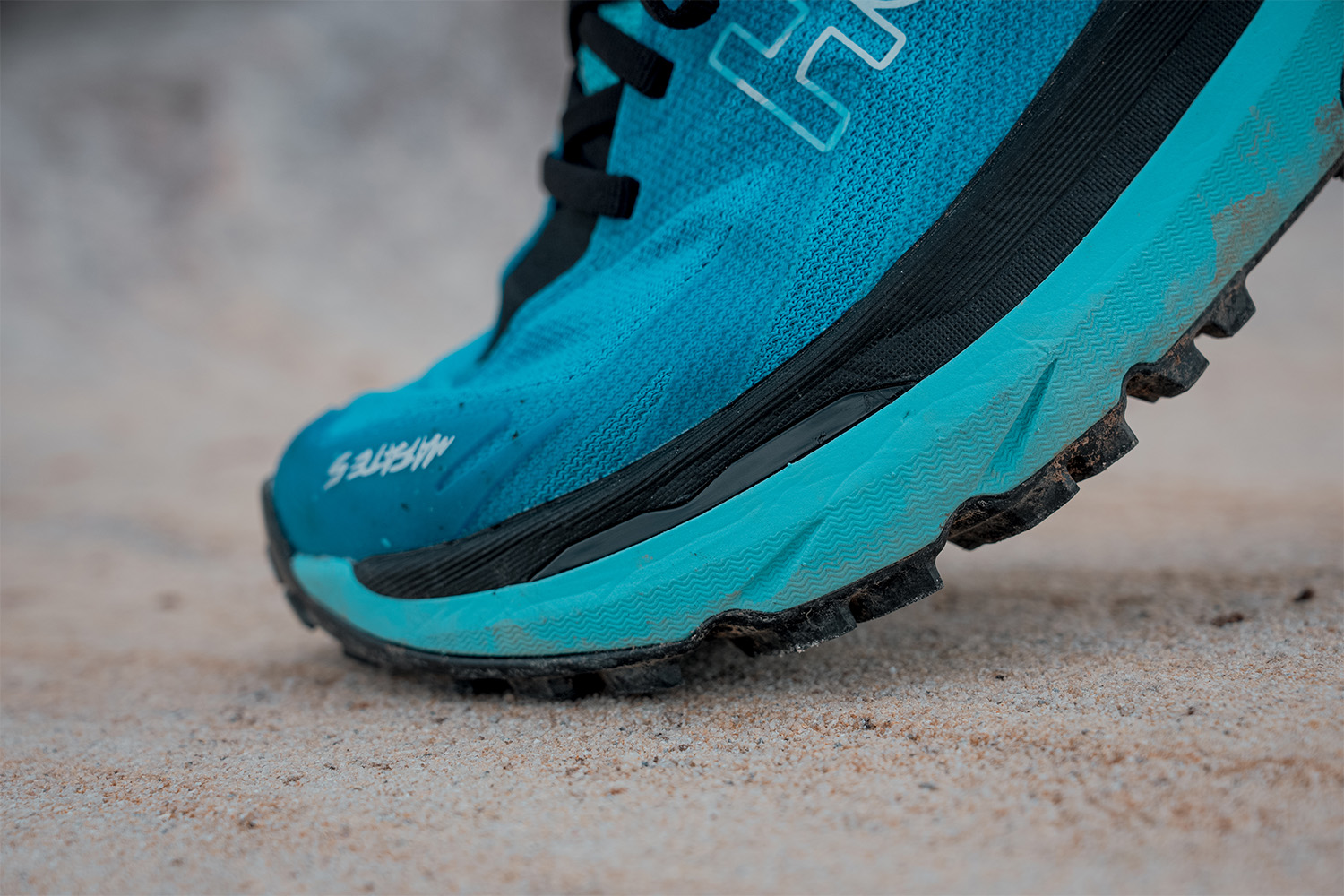 與前代最大的差異是 Mafate 5 首次導入的 Rocker Integrity 技術,這是在中底兩層泡棉之間嵌入一塊以 TPU 製成的曲面板材,提升滾動效率與穩定性,幫助跑者即使在長距離與疲勞狀態下,仍能維持步伐的穩定節奏。這項技術未來也將擴展至 HOKA 其他越野與健行系列鞋款。