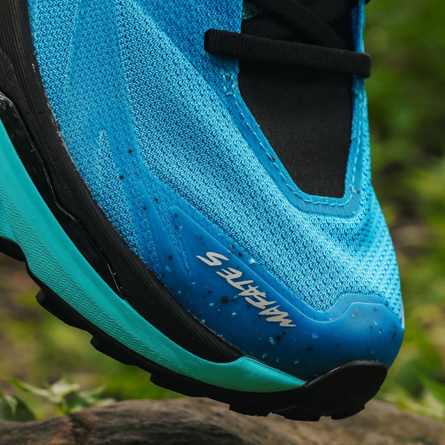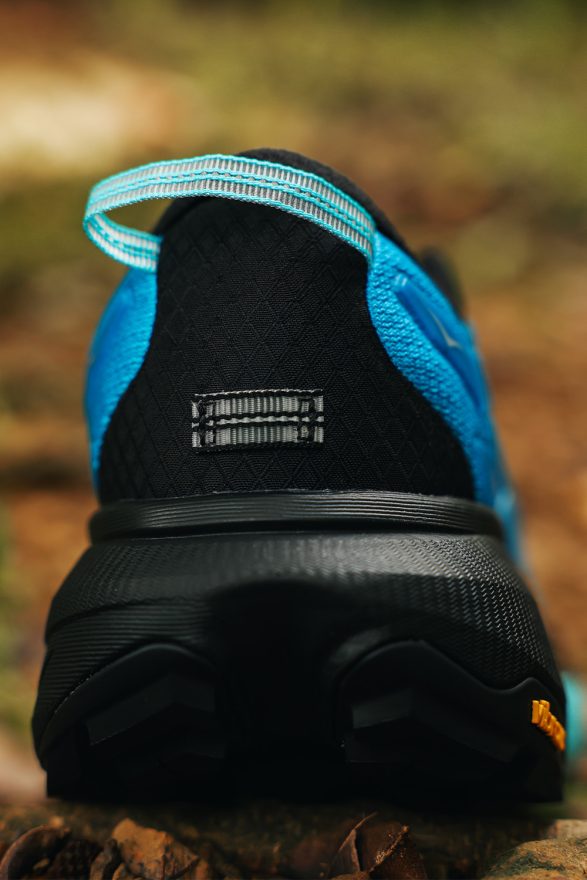 首先看到這雙鞋的核心亮點:中底,不同於 Mafate Speed 4 的 PROFLY+ 中底,Mafate 5 使用的是雙層泡棉中底,搭配首度亮相的 「Rocker Integrity科技」,帶來流暢穩定的前進體驗。中底上層以及後跟位置的泡棉為超臨界 EVA 泡棉 (黑色區塊),提供柔軟腳感與穩定回彈,在下坡時可有效吸收衝擊力;中底下層從中足至前掌位置為 CMEVA 泡棉 (藍色區塊),給予稍微偏韌的支撐感受,在面對平路或是爬坡路段時,能得到提供更有效率及能量回饋的推蹬力。