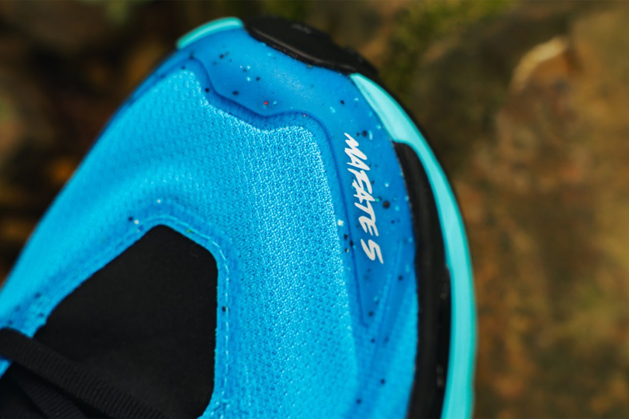 為了優化鞋款機能,Mafate 5 的鞋面選用抗磨損的 Warp 編織材質,並在鞋身多區域 (包含鞋頭) 加入 TPU 支撐結構,打造出包覆性強、耐磨性高的鞋面,比傳統網布更能夠承受山徑常見的摩擦與拉扯。輕薄的 V 型鞋舌在中段位置設有小襯墊,下半部使用彈性材質,除了能良好地與腳背服貼之外,還保有優秀的舒適性。