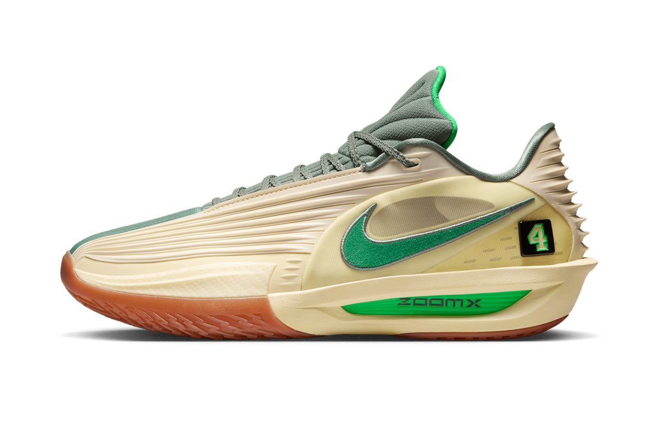 有注意到 Sabrina 3 ‘Blue Print’ 右下方那雙 G.T. Cut 3 Turbo 嗎?沒錯,那雙正是前波士頓賽爾提克隊球員 Jrue Holiday 的專屬 PE 款。全鞋採用大面積淡黃色為主調,其他部位與細節處則以綠色點綴,後跟外側印上他的背號「4」,整體風格與綠衫軍形象相當契合。