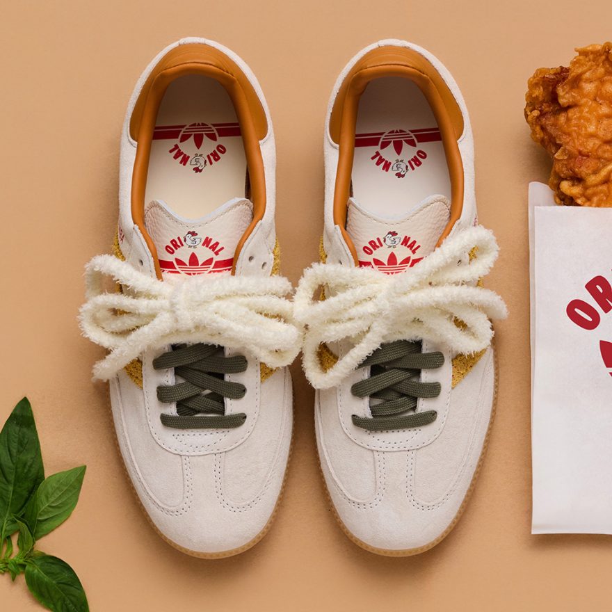 adidas Originals「ORI雞NAL 雞排系列」靈感源自台灣最接地氣的國民小吃-台式炸雞排。這次翻玩 ORI「雞」NAL 原創 logo 設計,帶來令人會心一笑的玩味細節。系列亮點單品為限定版 SAMBA 雞排鞋,以米白色麂皮皮革作為鞋身主色調,鞋側三條線炸粉黃點綴紅色小點象徵調味的辣椒粉;後跟以橘色皮革呈現雞排酥脆色澤。鞋墊印上 ORI「雞」NAL 插畫圖案驚喜,鞋帶提供兩種選擇:墨綠色靈感源自台式雞排靈魂配料九層塔,另一款則以乳白色絨毛鞋帶呼應羽毛的蓬鬆感。