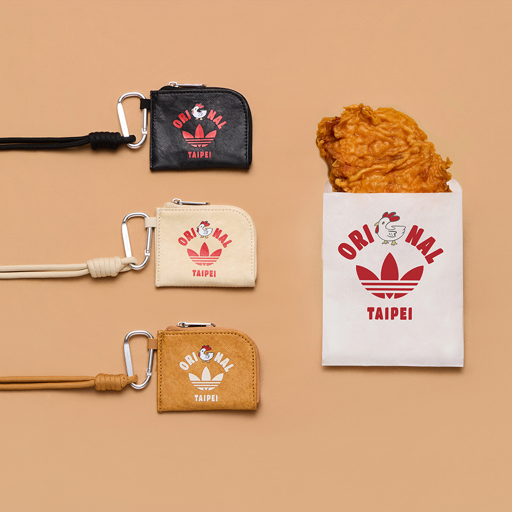 配件部分,台式炸雞托特包 提供黑、米兩款,不只印上限定 logo,背帶上的三葉草絨毛吊飾,可愛又吸睛,大容量設計兼顧收納與造型。雞排卡夾包 取材自雞排包裝紙紋理質感,米、橘、黑三種皮革,小巧實用,附掛鉤與掛繩,方便隨身攜帶,把台味元素融入日常。