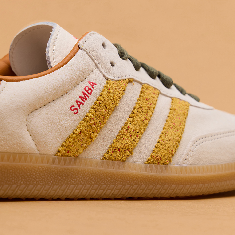 adidas Originals「ORI雞NAL 雞排系列」靈感源自台灣最接地氣的國民小吃-台式炸雞排。這次翻玩 ORI「雞」NAL 原創 logo 設計,帶來令人會心一笑的玩味細節。系列亮點單品為限定版 SAMBA 雞排鞋,以米白色麂皮皮革作為鞋身主色調,鞋側三條線炸粉黃點綴紅色小點象徵調味的辣椒粉;後跟以橘色皮革呈現雞排酥脆色澤。鞋墊印上 ORI「雞」NAL 插畫圖案驚喜,鞋帶提供兩種選擇:墨綠色靈感源自台式雞排靈魂配料九層塔,另一款則以乳白色絨毛鞋帶呼應羽毛的蓬鬆感。