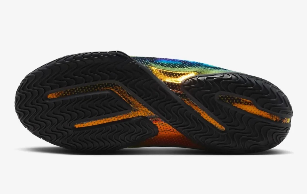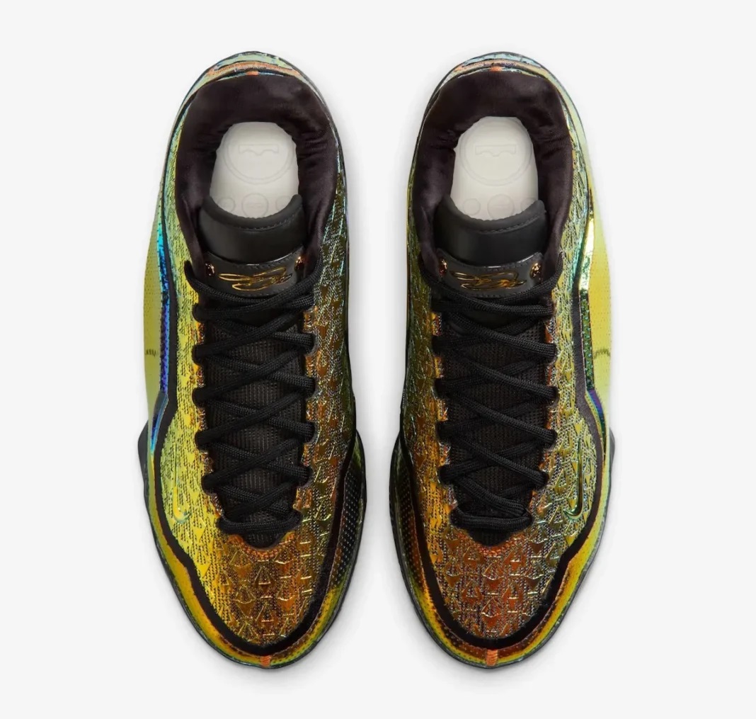 有別於最早曝光的測試版本是近乎全黑,這雙四萬分紀念版顯得高調許多,鞋面材質受光照射會映出炫麗色彩,讓鞋側的皇冠造型更加傳神,如此模樣也有鞋迷想起了 LeBron 11 EXT ‘King’s Crown’。