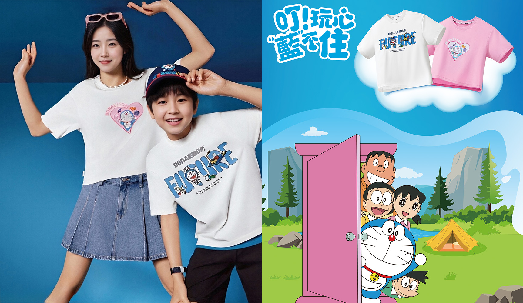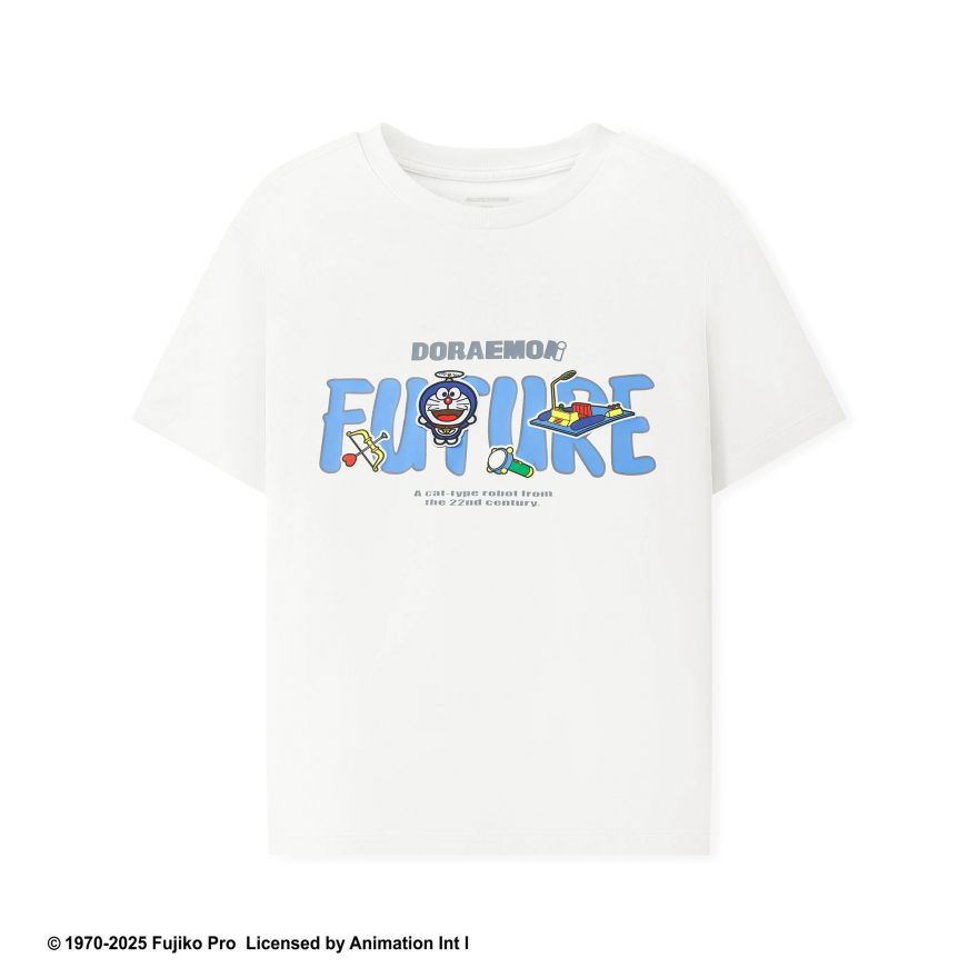 SKECHERS 的哆啦 A 夢系列商品以藍白色調為基底,巧妙融入任意門、竹蜻蜓、縮小燈、時光機等經典祕密道具圖騰,將跨越時空的奇幻想像轉化為印花與插畫圖樣。結合九宮格表情、心型插畫與「FUTURE」字樣,營造兼具童趣與潮流氛圍的設計細節,不僅承載孩子的幻想與笑聲,更成為親子間共同話題與記憶的橋樑。
