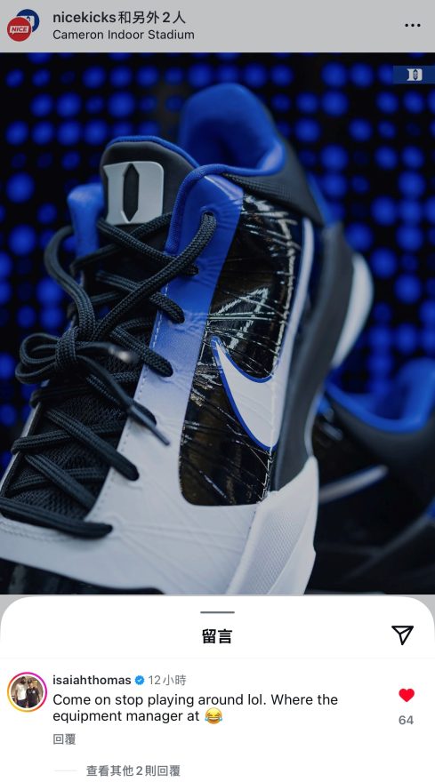 美國大學籃球新賽季到來,NCAA 各隊用的戰靴無疑是另一觀戰重點,特別是贊助商為球隊特製、無公開市售的球員版配色,總讓人格外羨慕,甚至連見過無數大場面的 NBA 球員也難抵抗其魅力。像是杜克男籃這回分享的 Nike Kobe 5 Protro PE,基本的代表色系、隊徽之外,漆皮鞋面還帶入漸層效果增添亮點,讓 Isaiah Thomas 忍不住留言問:「別鬧了,你們裝備經理人在哪?」