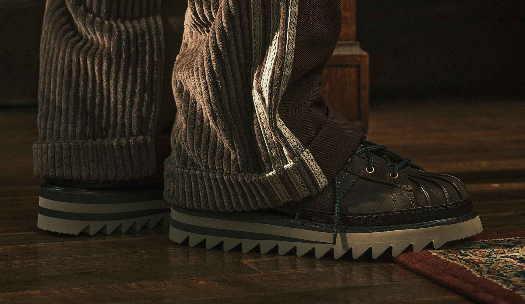 系列核心單品 CLOT Pro Model 以 adidas 經典 Superstar 為藍本,打造適合冬季穿搭的中幫靴款。鞋款提供海軍藍與棕色兩種配色,選用高級皮革搭配繩狀鞋帶,並輔以厚實鋸齒外底提升實穿性。金色鞋眼與鞋舌上的 CLOT 標誌為細節加分,讓整體在工藝質感與文化敘事間達到平衡,呈現運動美學的全新演繹——兼具粗獷與精緻的現代風格。定價 7,200,型號分別為 JQ1260 (海軍藍)、JQ1263 (棕)。