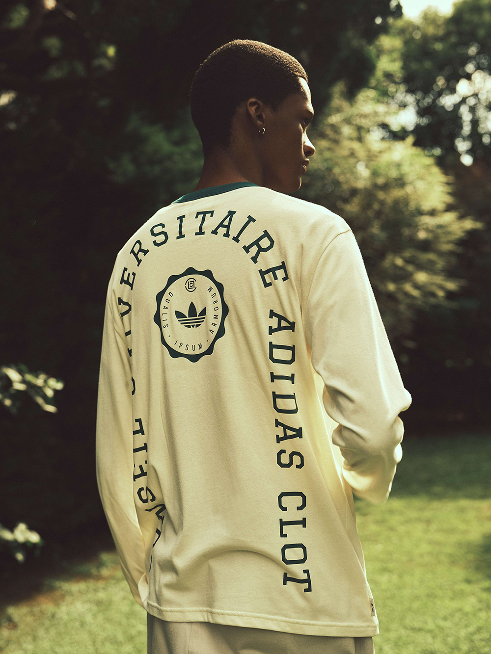 基礎款單品則包括印有「Universitaire adidas CLOT」圖案的刺繡長袖 T 恤,徽章設計靈感源自大學校徽傳統;法式毛圈布半拉鍊衛衣與運動褲以舒適與質感兼備的面料打造,延續系列的學院精神。