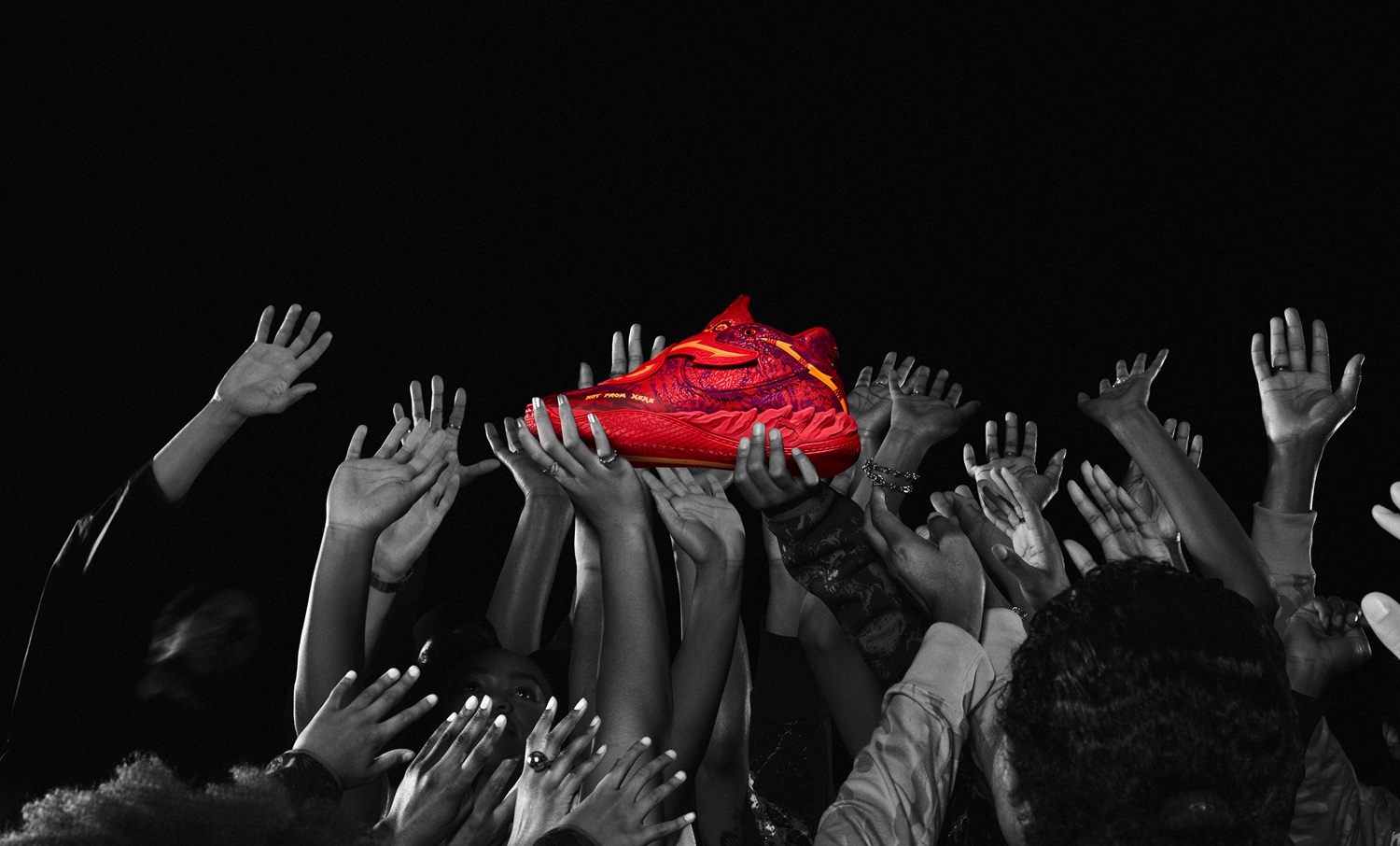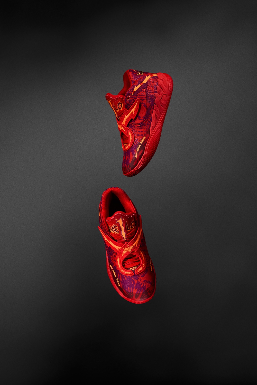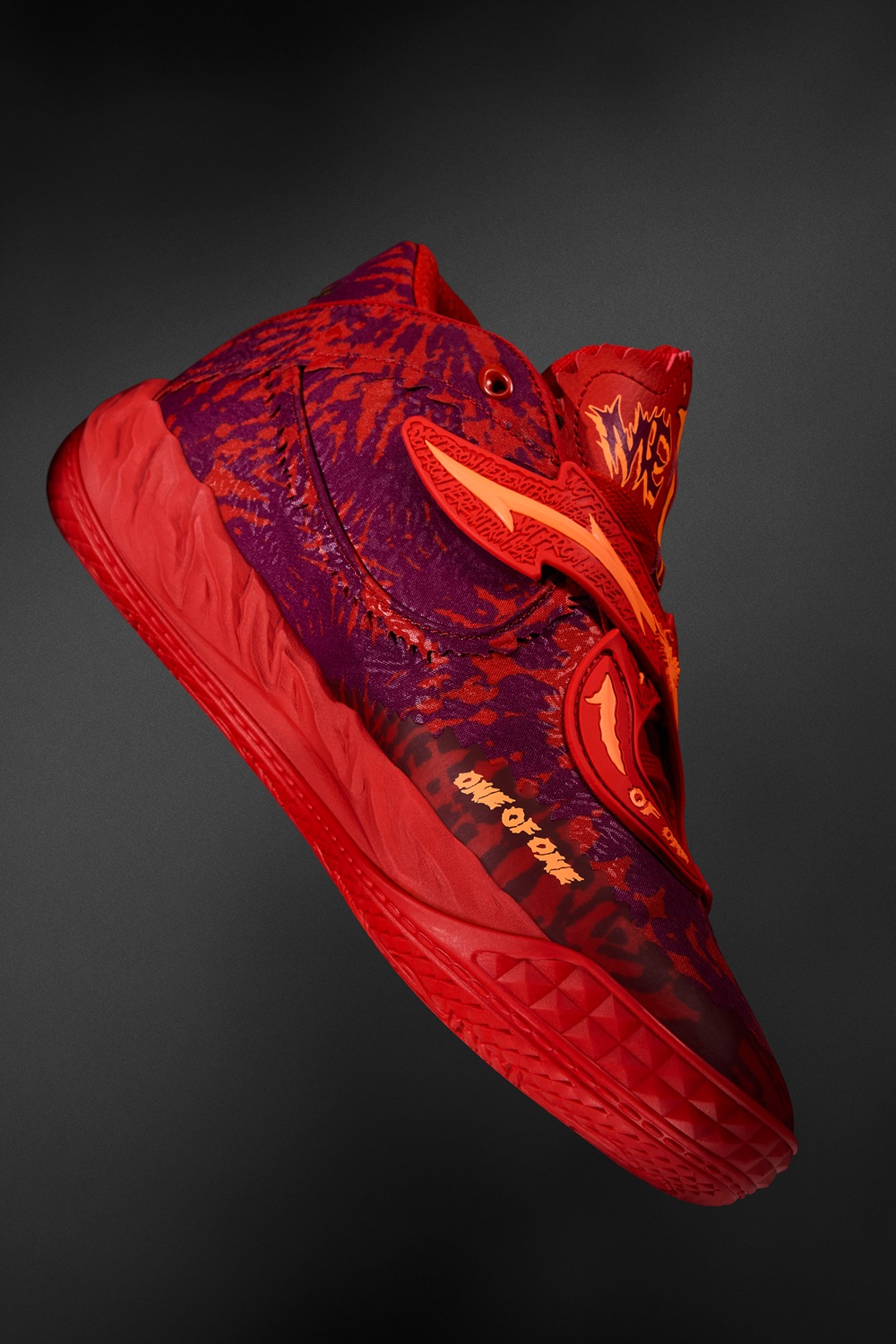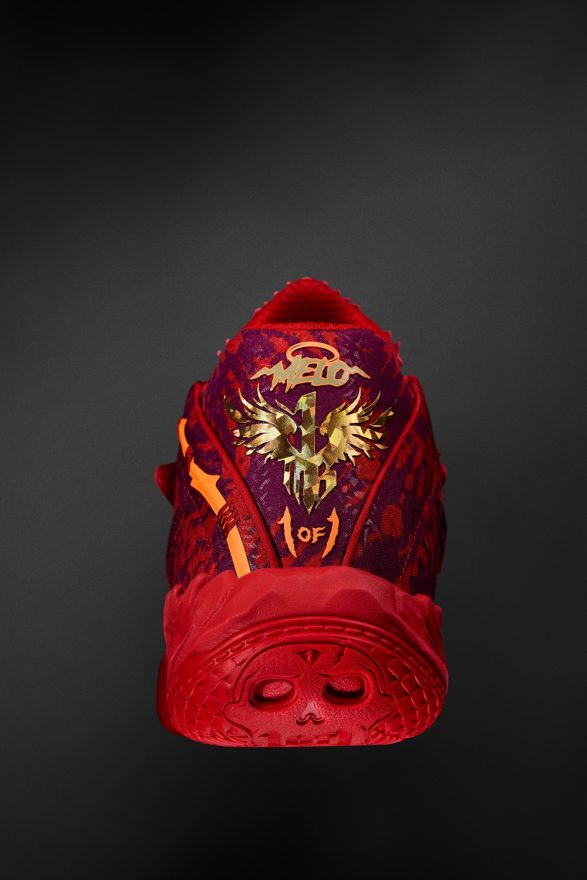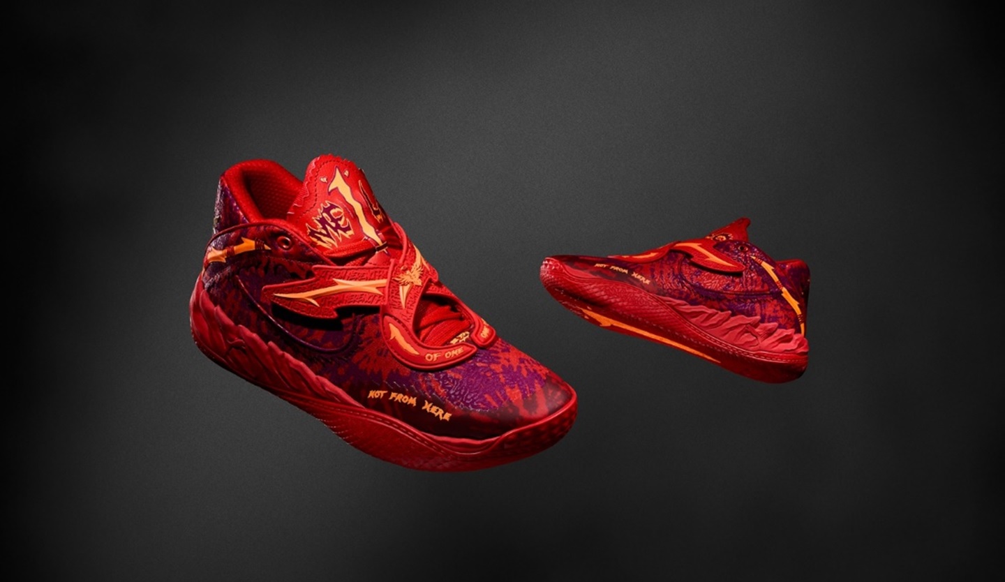 MB.05 Crowd Surf 以大膽的熾紅色渲染鞋面為設計主軸,結合立體雕塑感覆面與金色翅膀細節,呼應 LaMelo Ball 的「Not From Here」精神。以搖滾感十足的熾紅色漸層印花結合暖橘色呈現,傳遞滿滿視覺張力。外底則嵌入骷髏與「1」標誌,象徵 LaMelo Ball 對比賽的態度與獨一無二的個性。