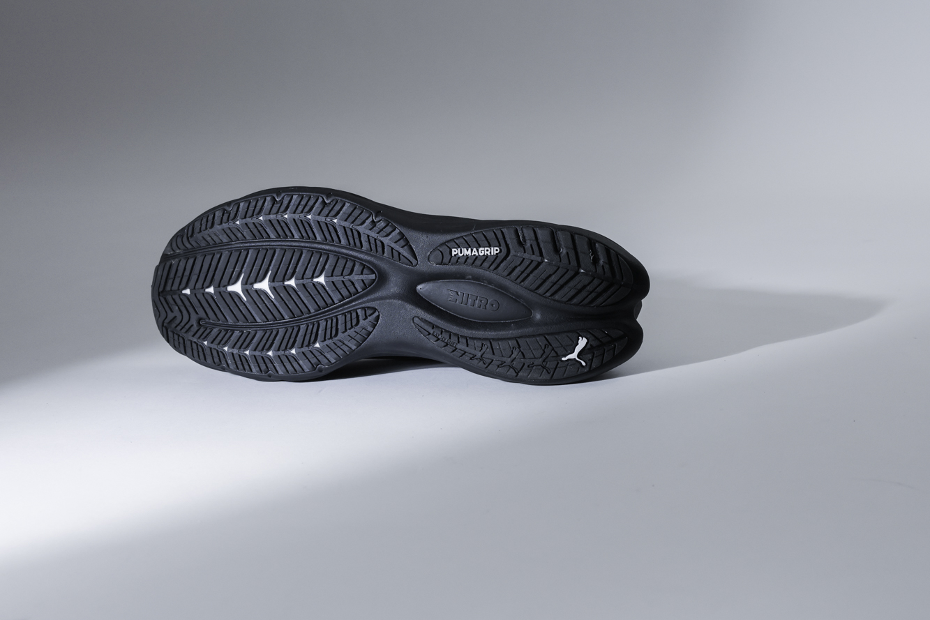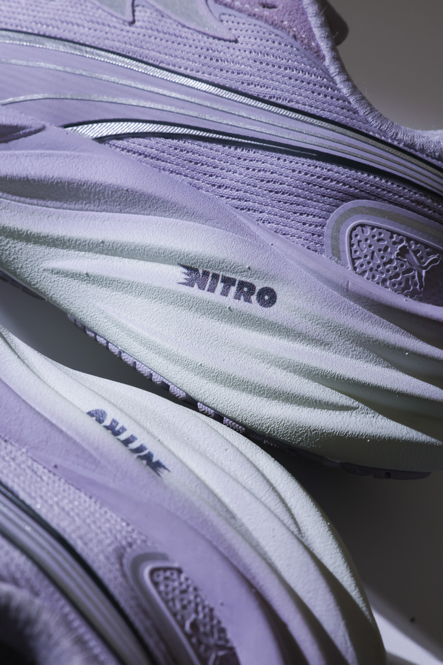 PUMA 近年以 NITRO™ 氮氣中底科技將跑鞋市場帶往氮氣的新領域,PUMA 創新 NITRO™ 氮氣科技中底是利用氮氣不易熱脹冷縮變形的物理安定性,將液態氮注入高品質物料製成的小型胚模中使其發泡延展,發泡完成後的中底便會透過氣泡造成肉眼看不見的空間,帶來輕量與高效緩衝並存的穩定腳感,再將發泡後胚模壓製塑形為最終中底,NITRO™ 氮氣科技中底比一般 EVA 中底材質輕量 46%,更比 PROFOAM 輕量 30%,讓中底兼具「輕量」與「高緩衝」的高穩定機能。