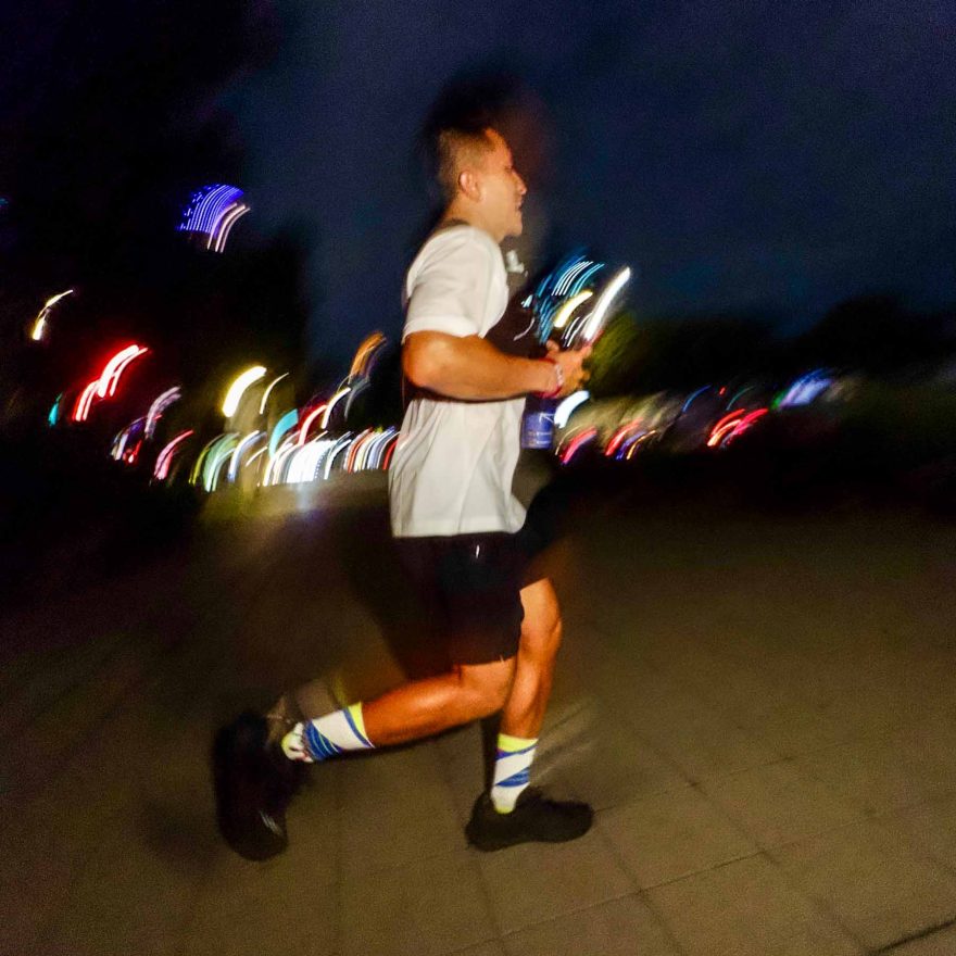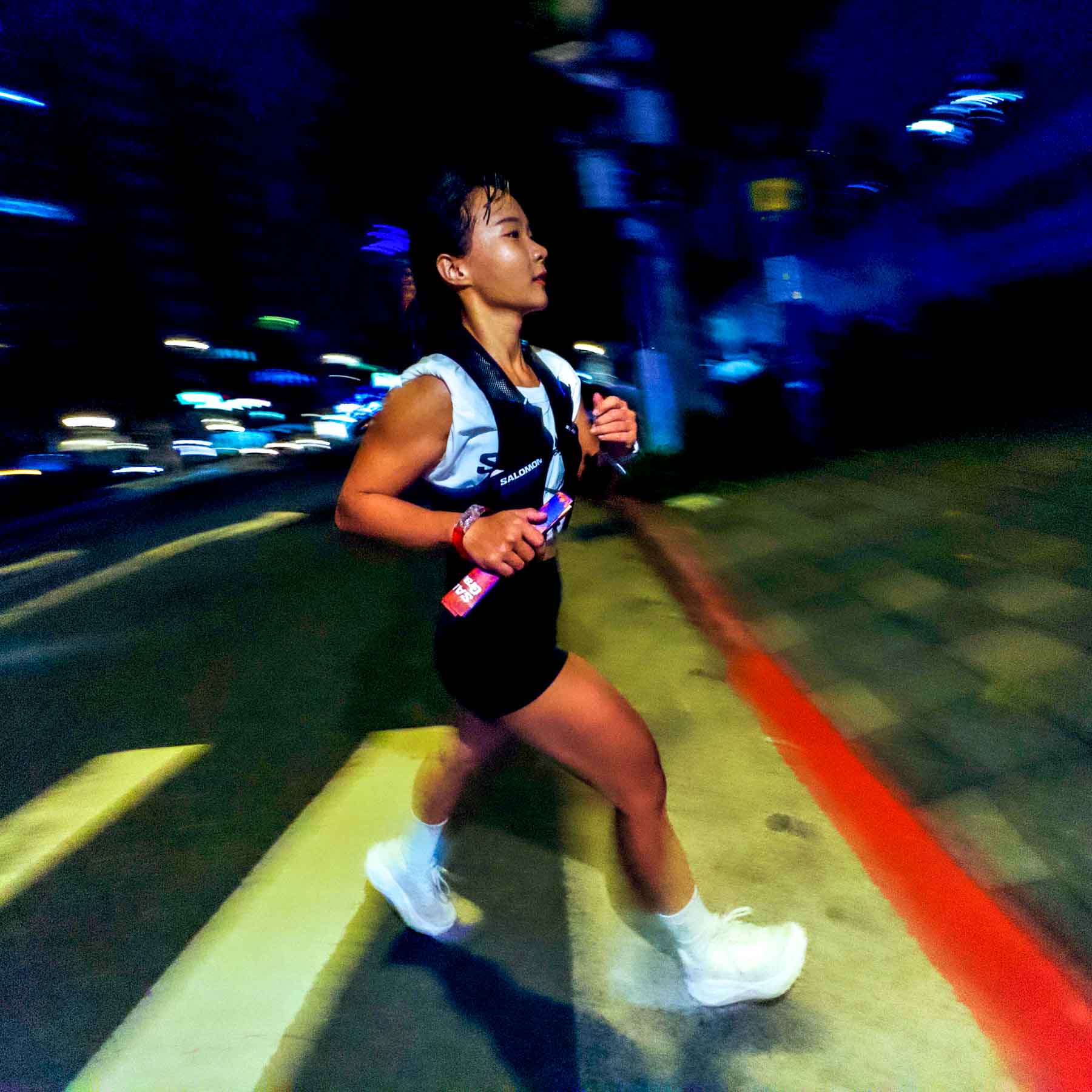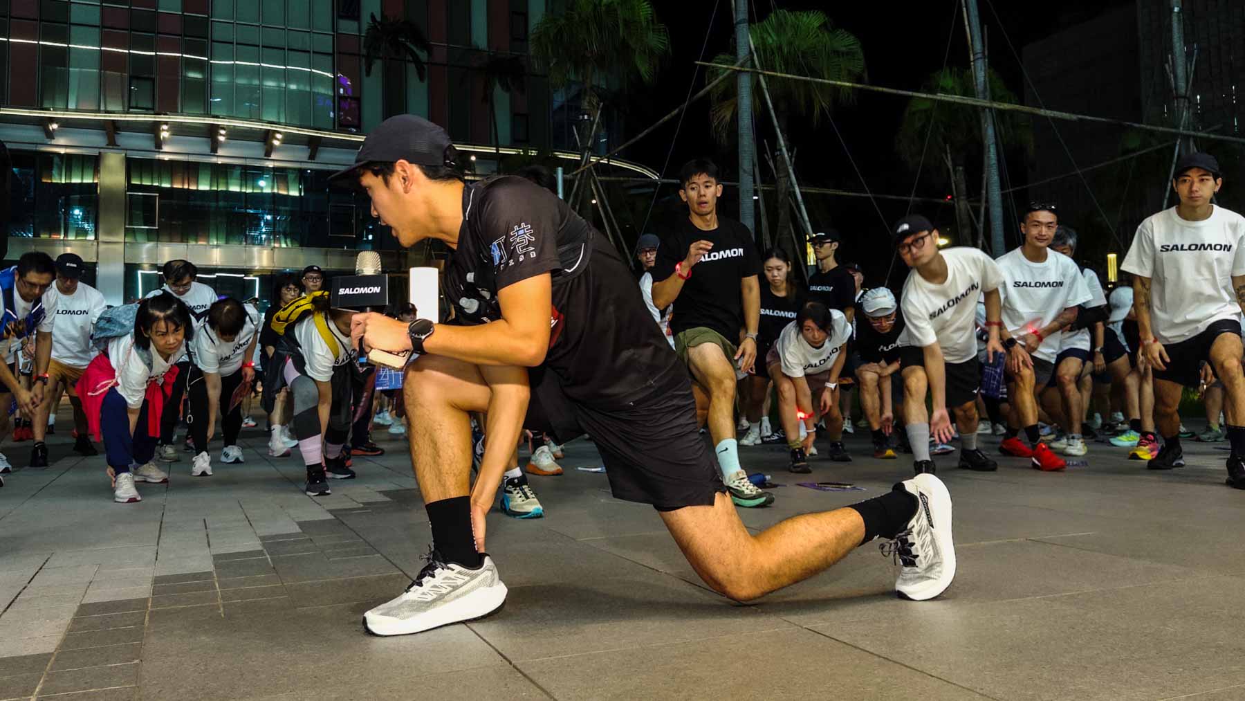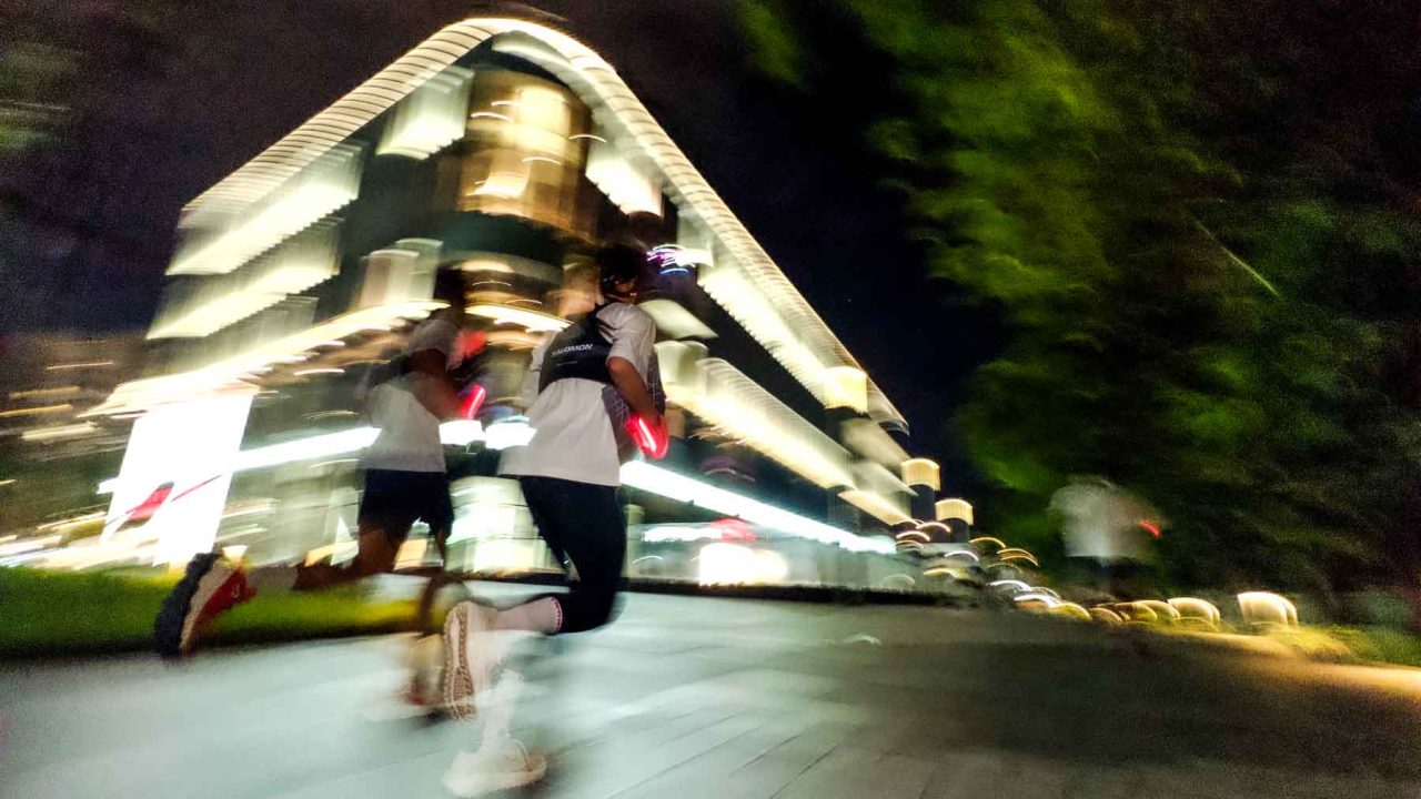 越野跑總會遇到的石階,這晚變成大樓逃生梯;路跑串連據點間,卻又能自然穿插草地無違和。我們不騎不開車,不坐捷運和公車,穿 SALOMON 跑遍 SALOMON。