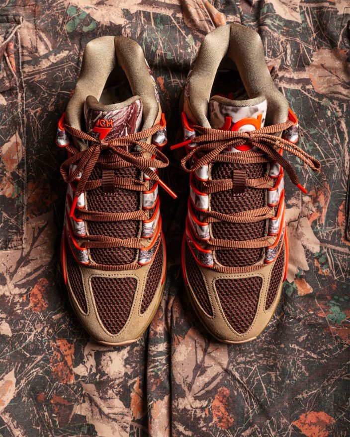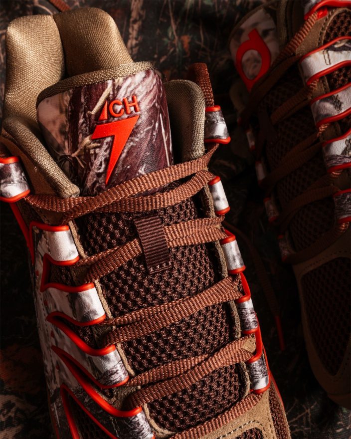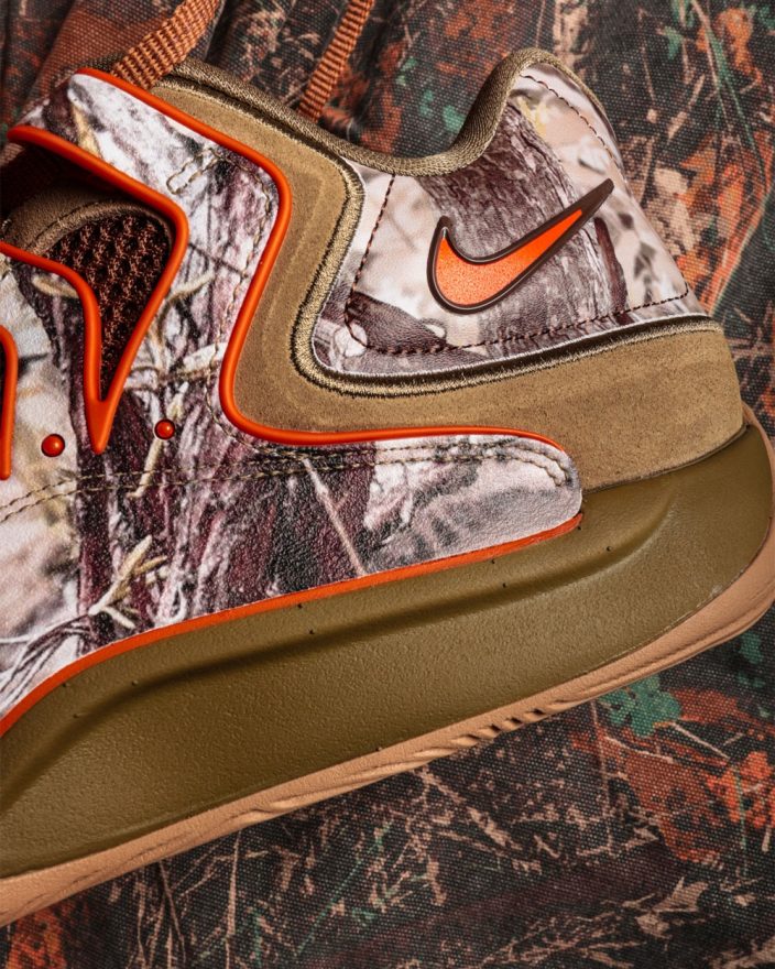 我們從攝影師 Riccardo Mestre 拍攝的照片看到清楚的鞋款外觀及細節,Chet Holmgren 專屬的 Nike KD18 ‘Camo’ PE 在右鞋舌放上個人Logo,鞋面以深淺不同的棕色為主要基底,再搭配亮橘色點綴,最醒目是鞋身還融入了大面積的森林迷彩,營造出粗獷的戶外氛圍。編輯個人覺得是越看越耐看,是實戰籃球鞋身上少見的設計。