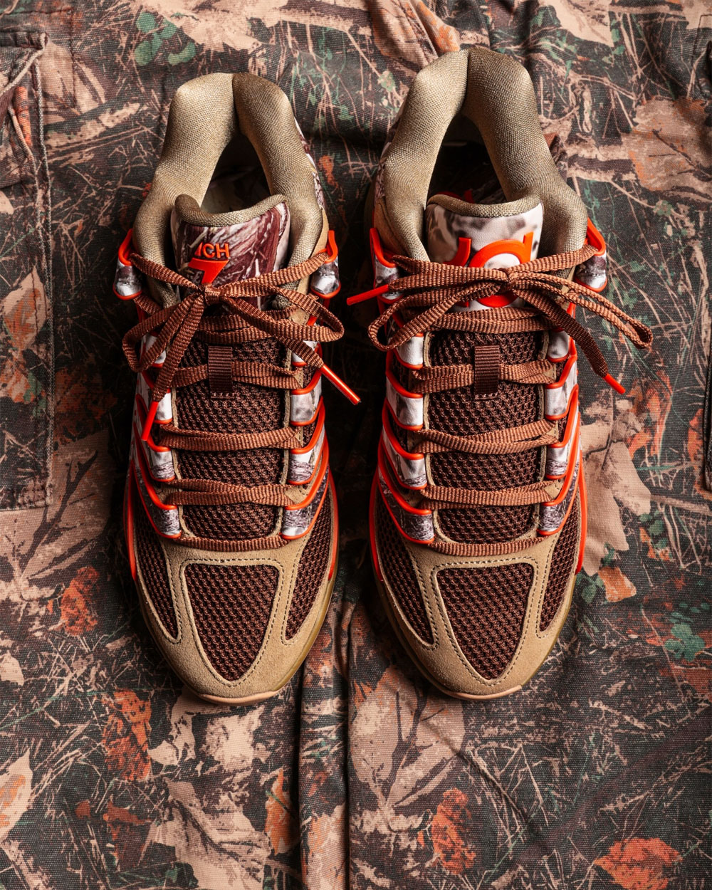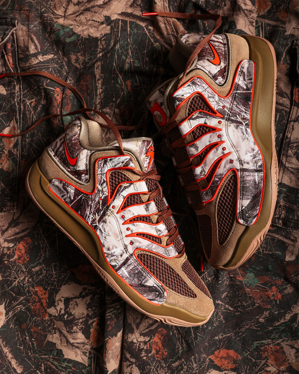 我們從攝影師 Riccardo Mestre 拍攝的照片看到清楚的鞋款外觀及細節,Chet Holmgren 專屬的 Nike KD18 ‘Camo’ PE 在右鞋舌放上個人Logo,鞋面以深淺不同的棕色為主要基底,再搭配亮橘色點綴,最醒目是鞋身還融入了大面積的森林迷彩,營造出粗獷的戶外氛圍。編輯個人覺得是越看越耐看,是實戰籃球鞋身上少見的設計。