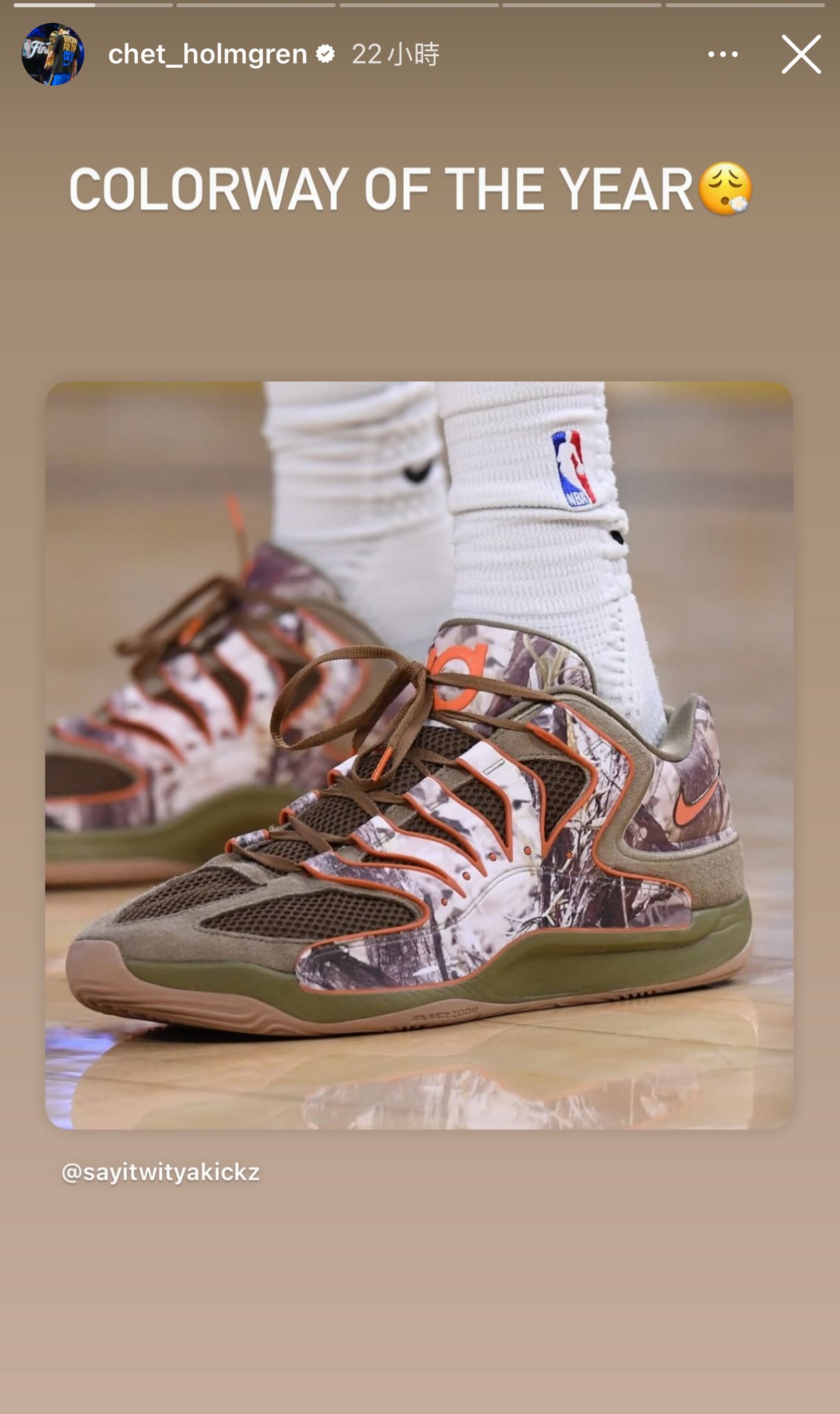 Chet Holmgren 在個人 Instagram 限時動態轉發媒體報導,並寫道 “COLORWAY OF THE YEAR😤” 看來他本人對這雙鞋的配色應該是相當滿意 (笑)。