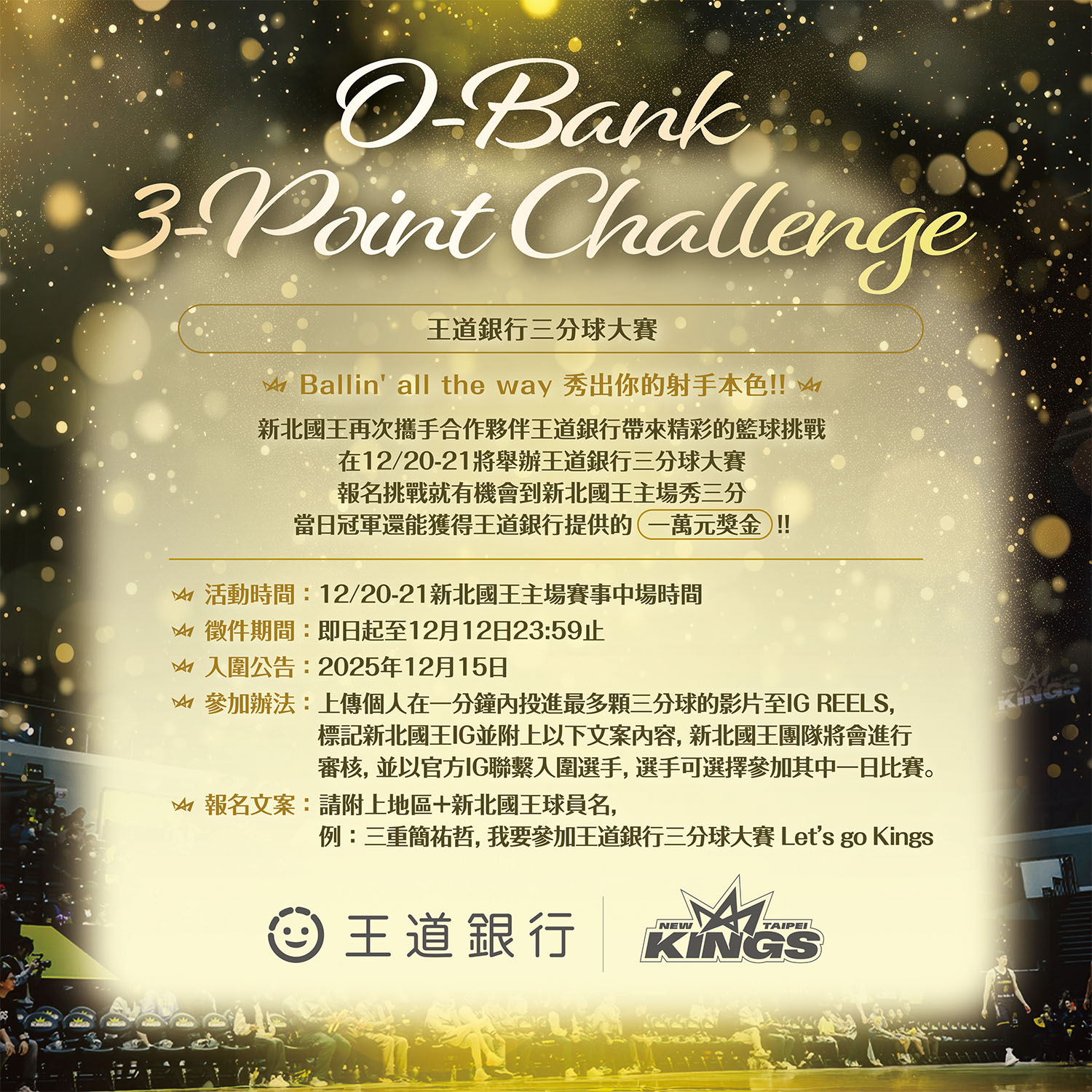 主題週活動中將推出新北國王首屆「三分球大賽」,邀請球迷走進新莊城堡展現射手風采,爭奪由王道銀行提供的一萬元冠軍獎金(刷卡金)。即日起至 12 月 12 日開放徵件,只要於 IG Reels 上傳一分鐘內投進最多三分球的影片並標記新北國王 IG,即有機會入選,在兩日比賽中場於主場現場比拚,一決高下。