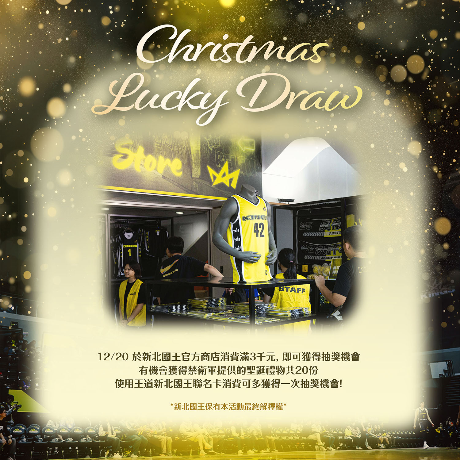 商品部同步規劃「禁衛軍 XMAS LUCKY DRAW」,讓主場化身聖誕交換禮物現場。球迷只要在新北國王官方商店單筆消費滿 3,000 元,即可獲得一次抽獎資格,有機會抽中球員精心準備的聖誕禮物,增添拆禮物的驚喜。活動將於 12 月 20 日登場,限量 20 份,使用王道新北國王聯名卡消費還可再加碼一次抽獎機會,把聖誕好禮帶回家。