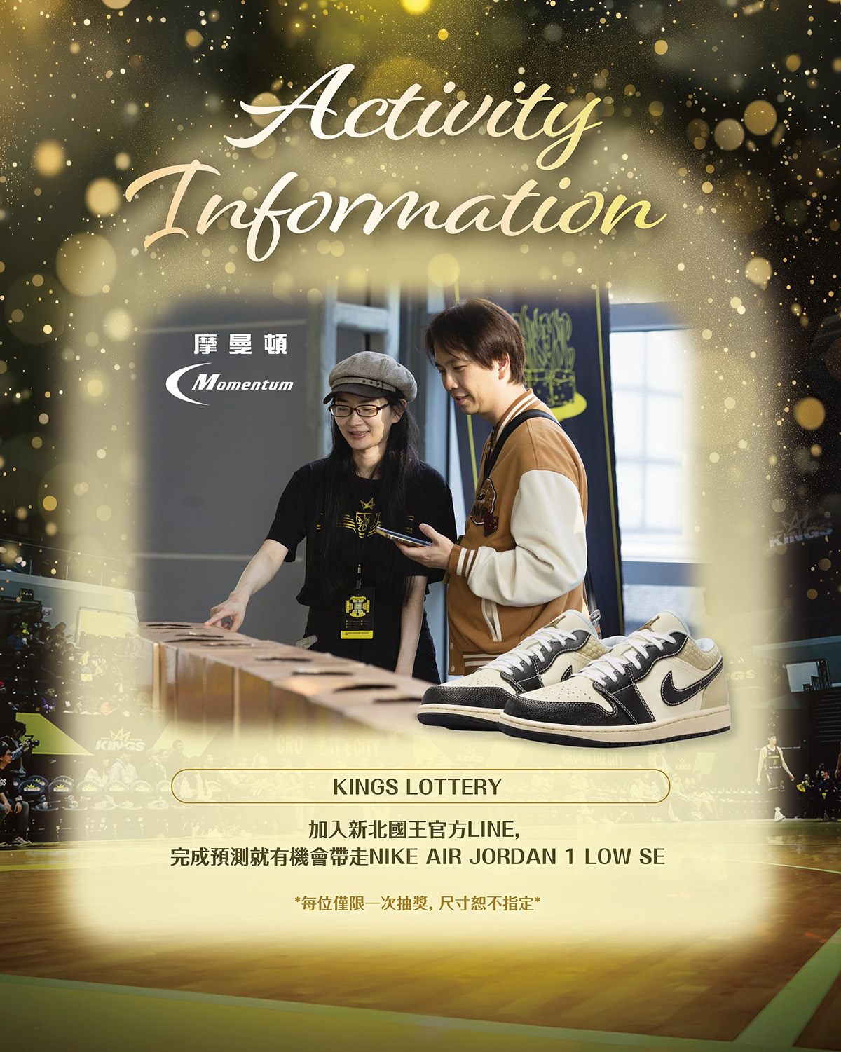 在皇家周邊活動方面,除了有設置奧帝臂展、沃許本照片打卡牆讓大家拍照打卡之外,這回的 KINGS LOTTERY 活動,只要前來現場觀賽的球迷們完成指定的預測活動,就有機會帶走 Air Jordan 1 Low SE 球鞋。(每位僅限一次抽獎,尺寸不指定)