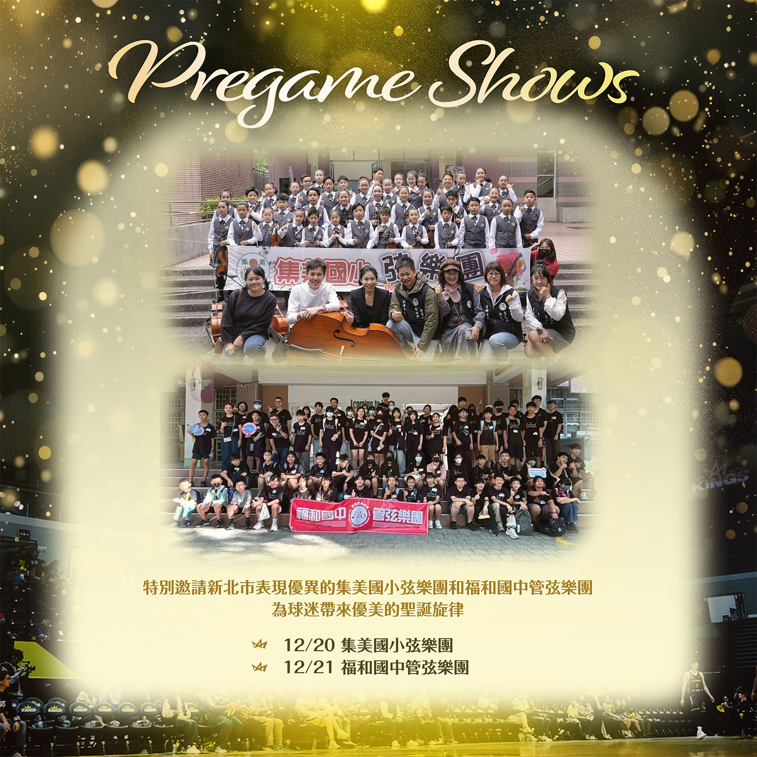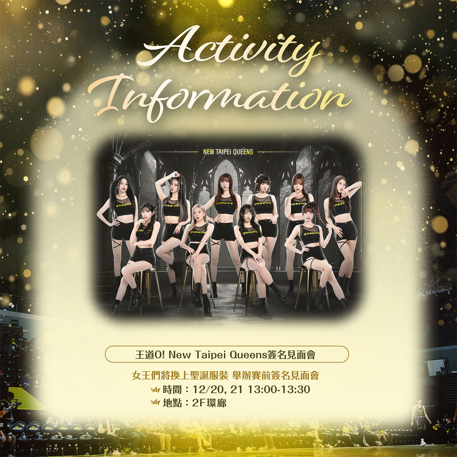 兩日賽前也將安排集美國小弦樂團 (12/20) 與福和國中管弦樂團 (12/21) 帶來聖誕演出,新莊二樓環廊打造「國王聖誕美食市集」,營造悠閒且充滿節慶氛圍的球場體驗。此外,New Taipei Queens 也將於兩日下午1點至1點半舉辦聖誕簽名見面會,與球迷近距離互動,共度歡樂聖誕週末。