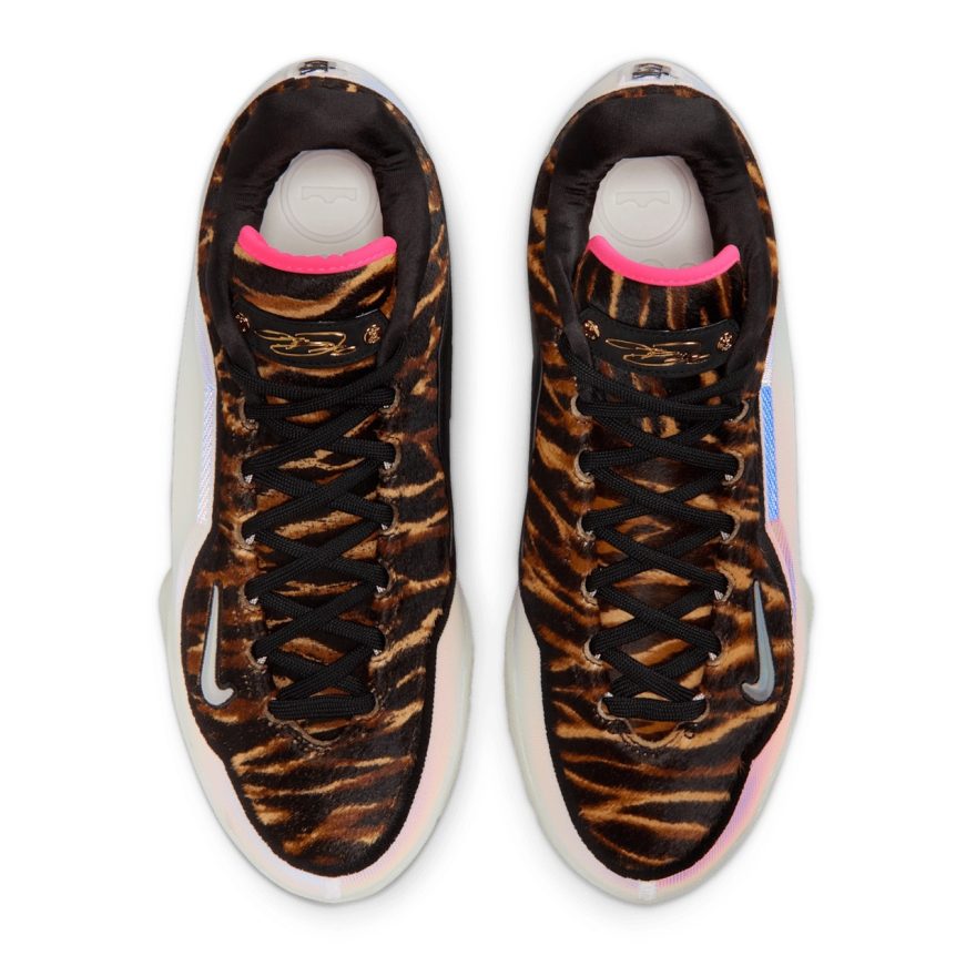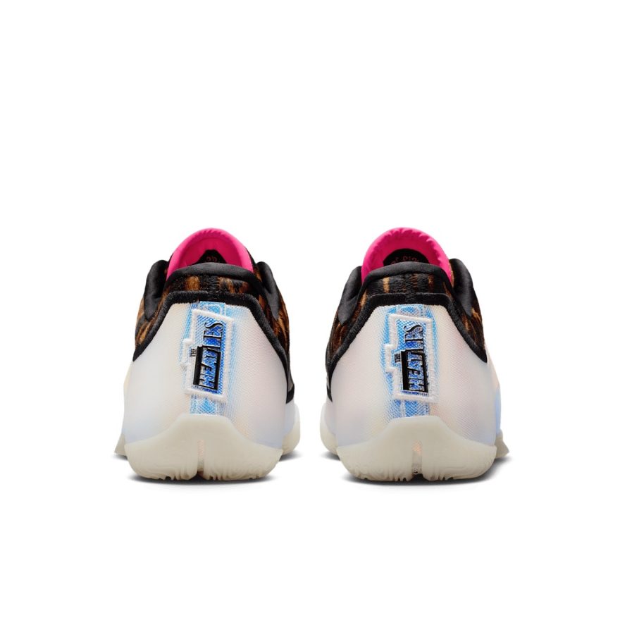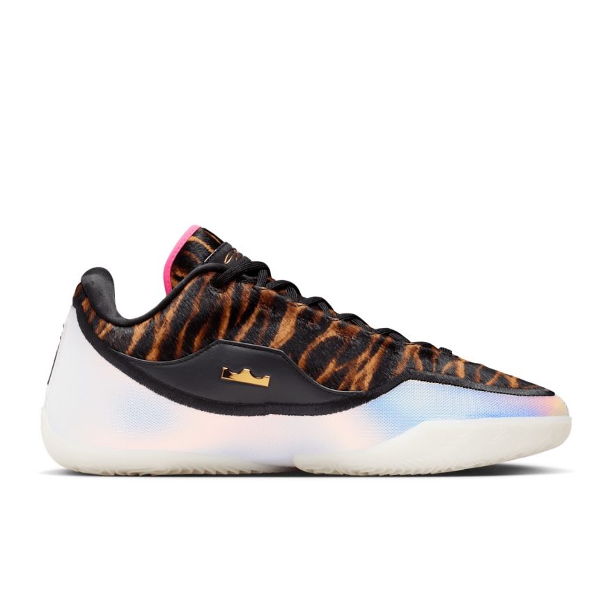 LeBron XXIII ‘Heat Wave’ 採用狂野且充滿藝術氣息的設計,鞋面披上動物皮紋,周圍皇冠造型的穩定系統映著虹彩光澤,猶如大海水面波光粼粼的模樣,加上招牌的南灘配色點綴,營造屬於邁阿密南灘的氣息。