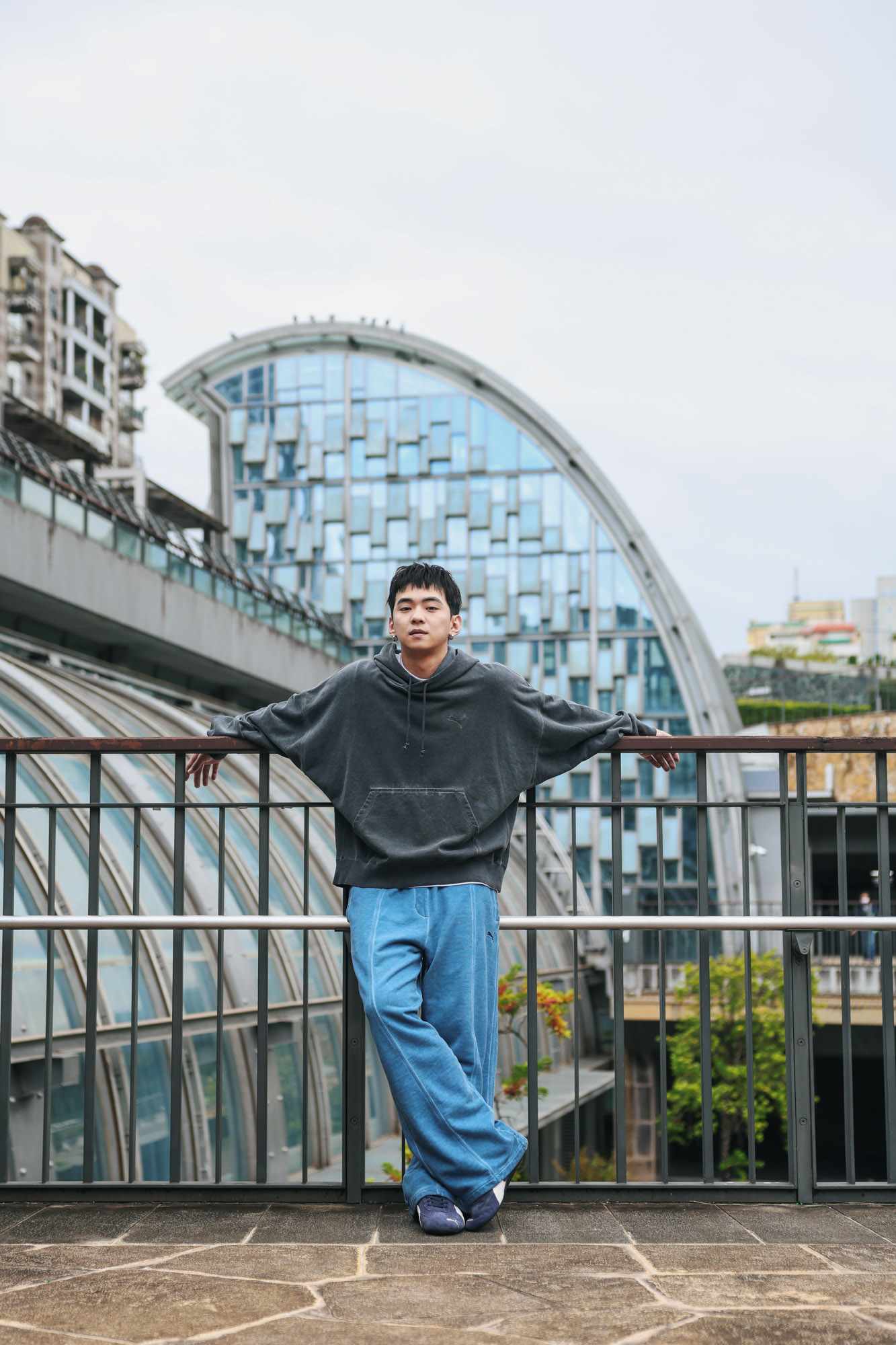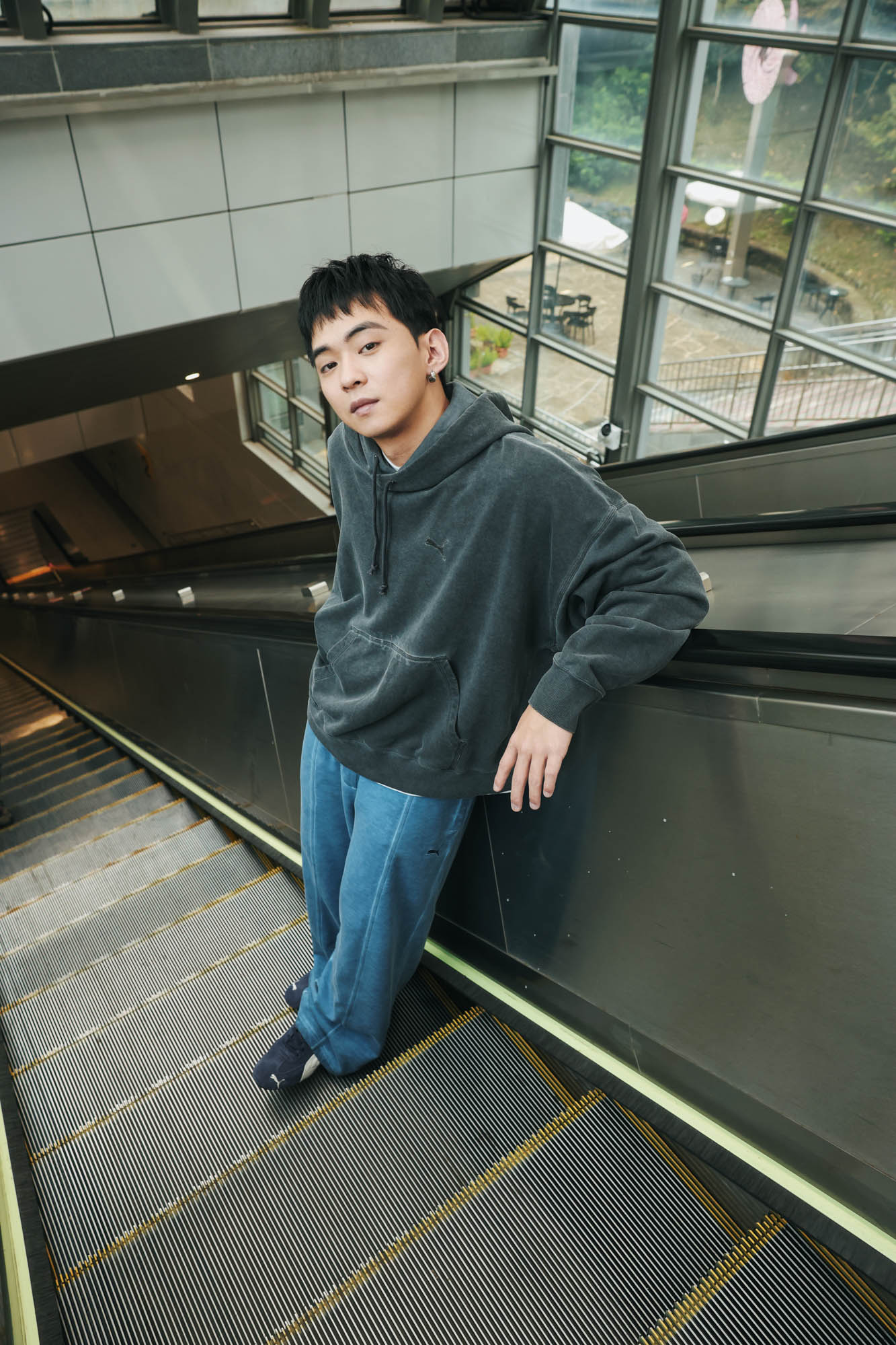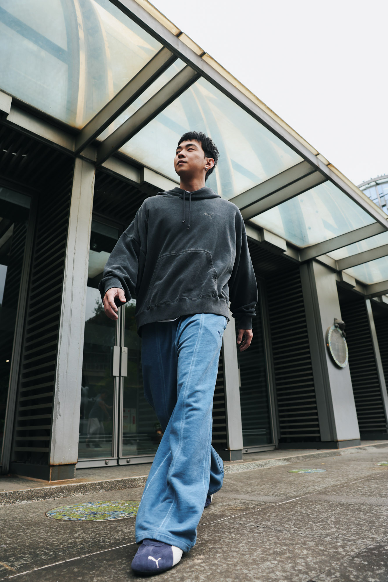 想要讓 monotone 多些變化,可以從顏色切入,保留同一款長褲,還有當然的主角「丹寧藍 SPEEDCAT」,上衣換上同樣是水洗方式、有著刷舊細節的連帽 T 恤,以設計手法統一整體造型,保留內搭的白色T 恤,微微露出領口與下襬,整個人看起來會更為青春自在。