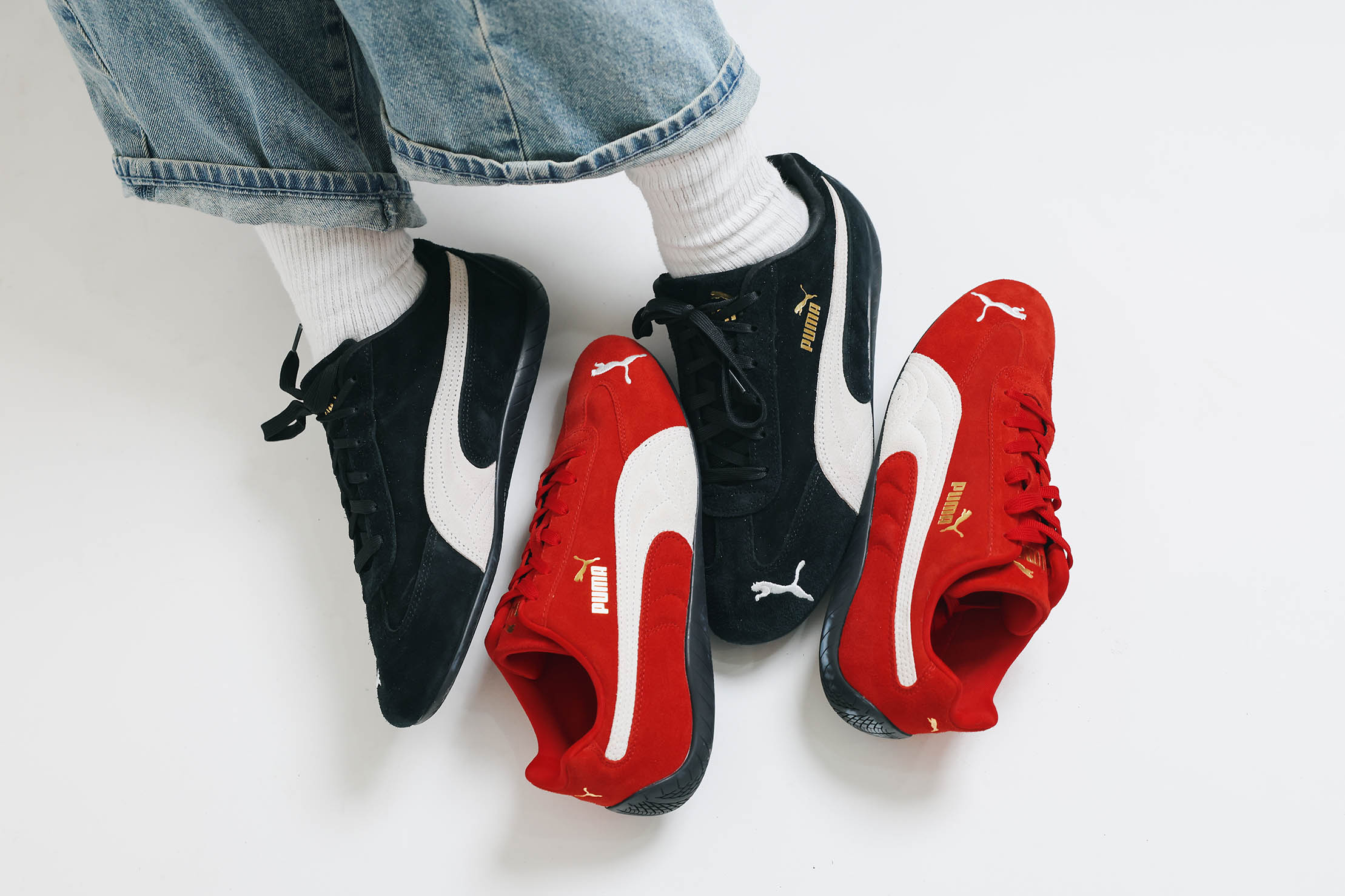 這裡說的「舊」並非過去,而是「OG」,回歸到最原始的配色與材質,以 SPEEDCAT 而言,就是融合著千禧美學與賽車基因的紅色與黑色。SPEEDCAT 最初作為 RACE CAT 的低筒版本推出,2023 年因為 Y2K 風潮的盛行,SPEEDCAT 以質感麂皮材質,以及向 F1 車隊致敬的配色,忠於經典原版設計,窄型輪廓、鮮明的薄底,鞋頭繡有標誌性跳豹圖案、金色 logo 裝飾的鞋舌,重新回到這個世代。