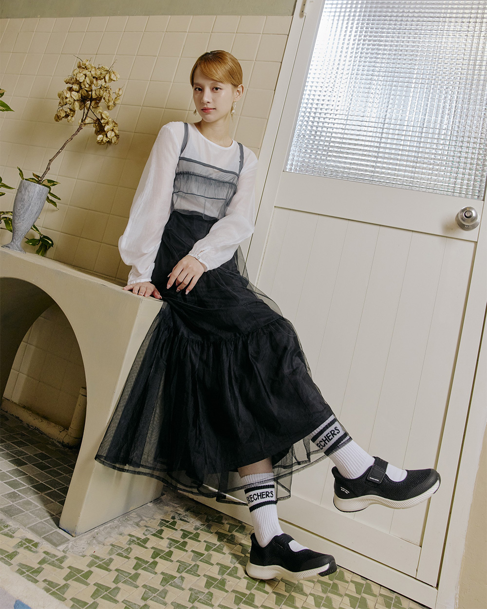 極簡的黑白配色搭配紗紡衣裙,在 SKECEHRS UNO RYZE 與 VAPOR FOAM MOVE 瑪莉珍鞋的襯托下,化成一股帶有故事感的韓系電影氛圍。SKECEHRS UNO RYZE 瑪莉珍鞋以深邃的黑色鞋面搭配細緻金色勾勒線條,與輕柔紗裙穿搭形成微妙平衡,是一種沉穩之間帶著光影流動的氣息;而搭載 Slip-ins 瞬穿舒適科技的 VAPOR FOAM MOVE 鞋款則以超輕量中底讓步伐自然變得輕盈,俐落的鞋面線條修飾腳背比例,為冬季偏厚重的穿搭創造了呼吸的空間,安靜卻醒目、低調卻自成氛圍,這份穿梭女孩與女人間的優雅不靠堆疊,而是從細節裡自然流露。