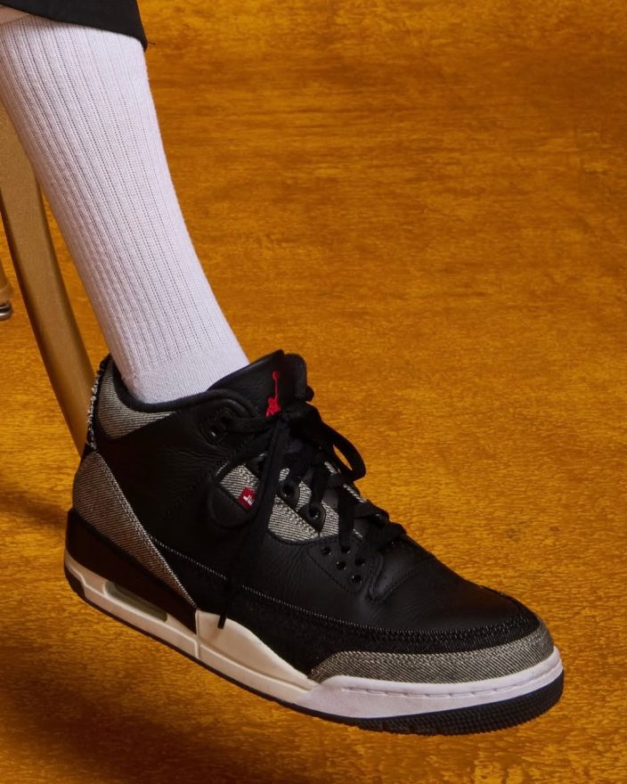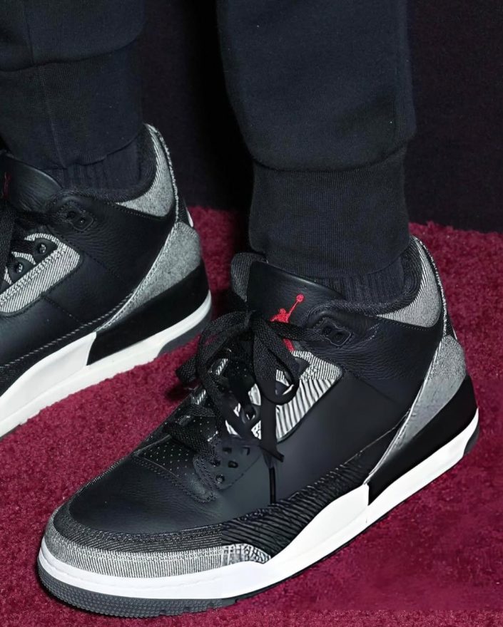 今年 11 月中上旬,美國知名導演、和 Jordan Brand 有合作關係的 Spike Lee,去尼克主場看球時穿著了一雙尚未發售的 Levi’s x Air Jordan 3,正當大家在等待官方公開聯名消息之時,近日 Spike Lee 又穿上了另一款激似「黑水泥」的 Levi’s x Air Jordan 3 新色。