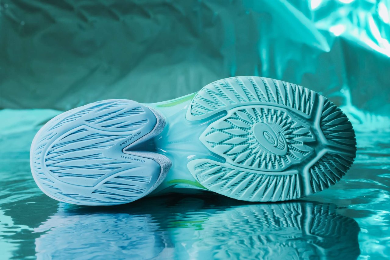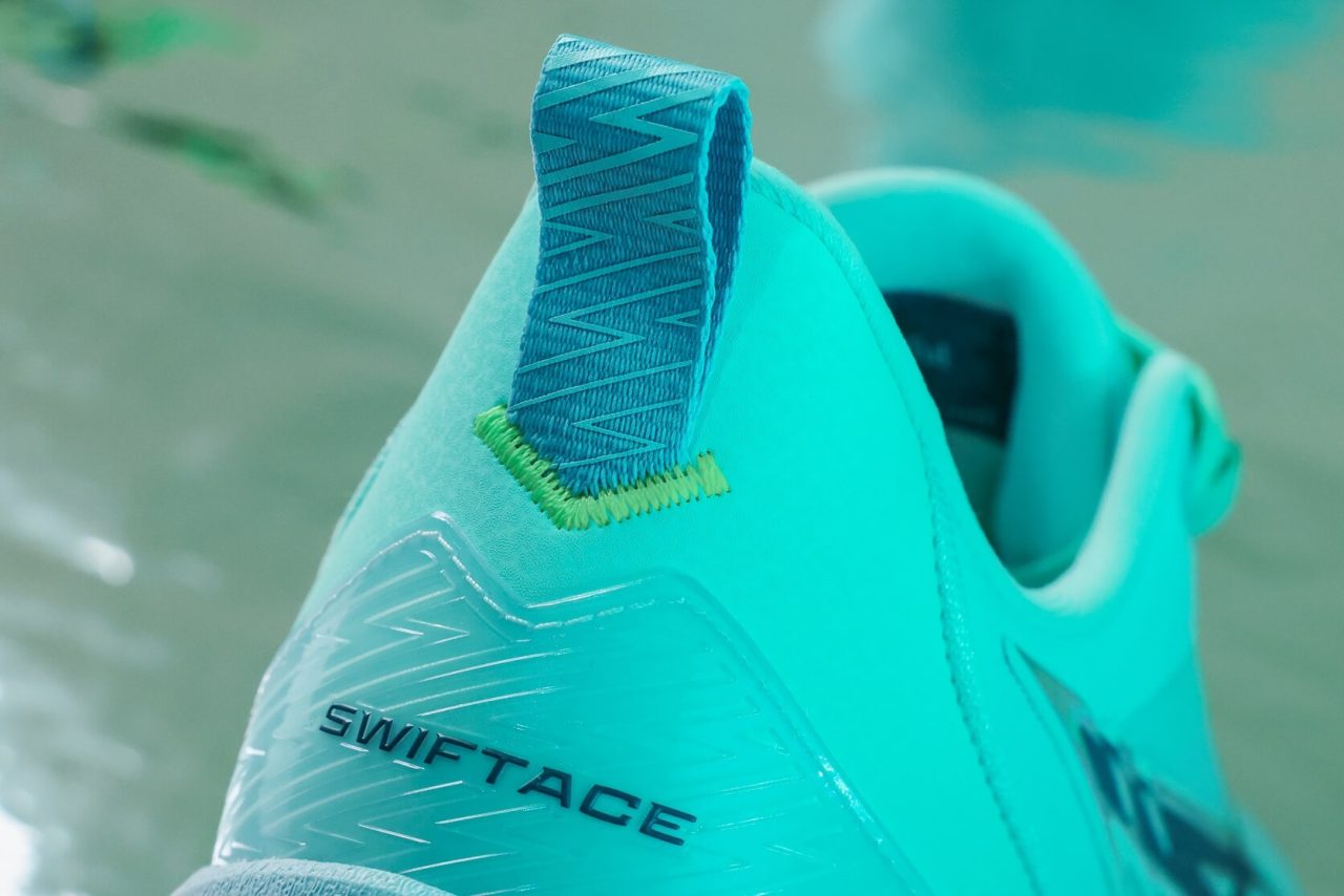 作為一雙速度導向、針對場上推進飛快的球員而設計的球鞋,從外觀就能明顯看出中底採「後高前低」之型態,幫助身體前傾催出速度。據官方提供的資料,SWIFTACE YUKI 足跟差達 10mm,後跟 FLYTEFOAM 微微的彈性加上前傾設計,有點像田徑場上的起跑架之概念,不自覺會想壓低重心、把腳步跨大。前掌偏薄,是場地感鮮明的那種設定,當重心壓在腳掌前半部,觸覺感官也即刻啟動。
