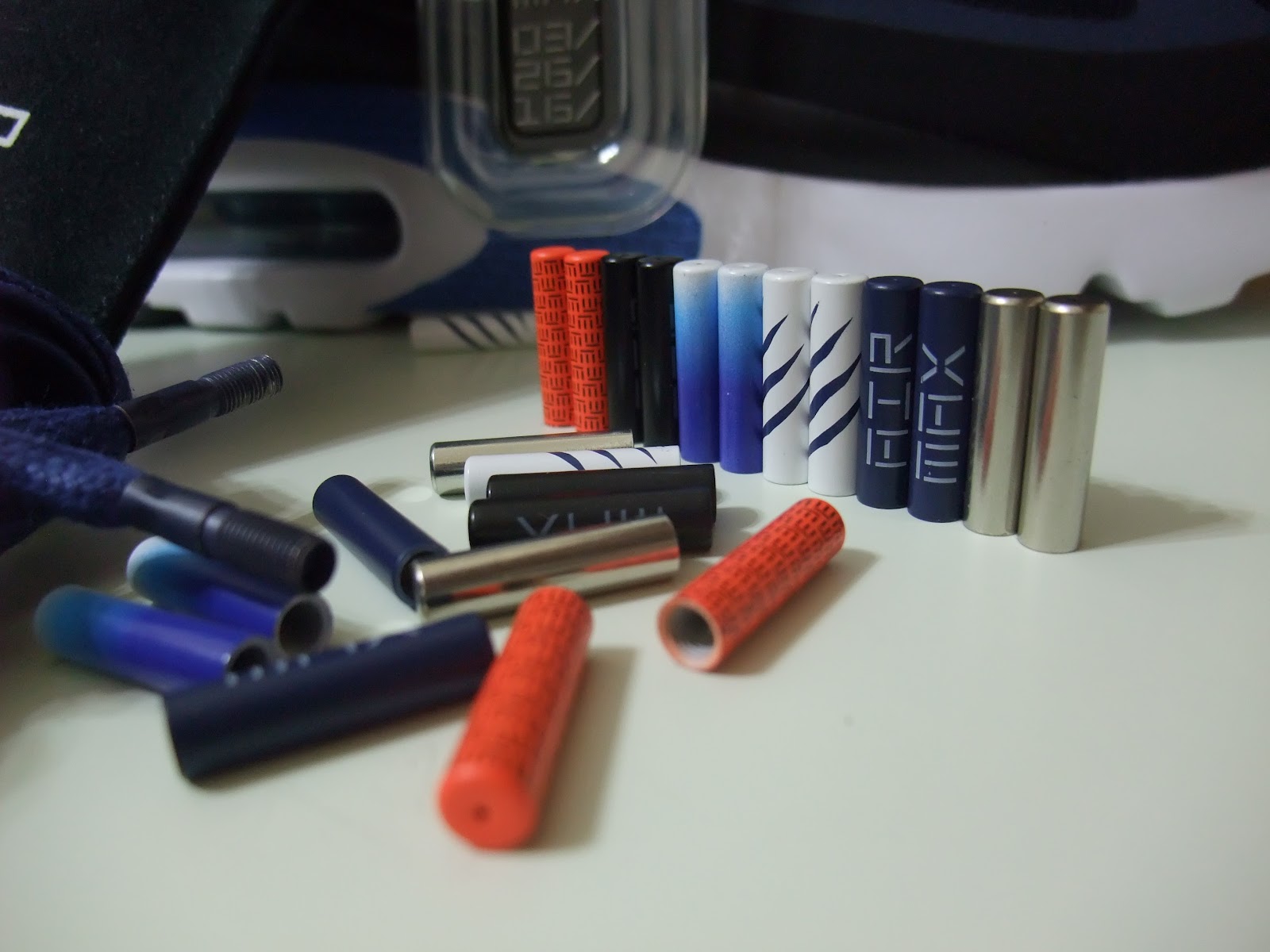 6款鞋帶頭分別是:銀色(無圖樣)、黑色(AIR MAX)、深藍色(AIR MAX)、橘色(滿版的M字樣印刷)、白(爪痕)、藍(漸層藍)